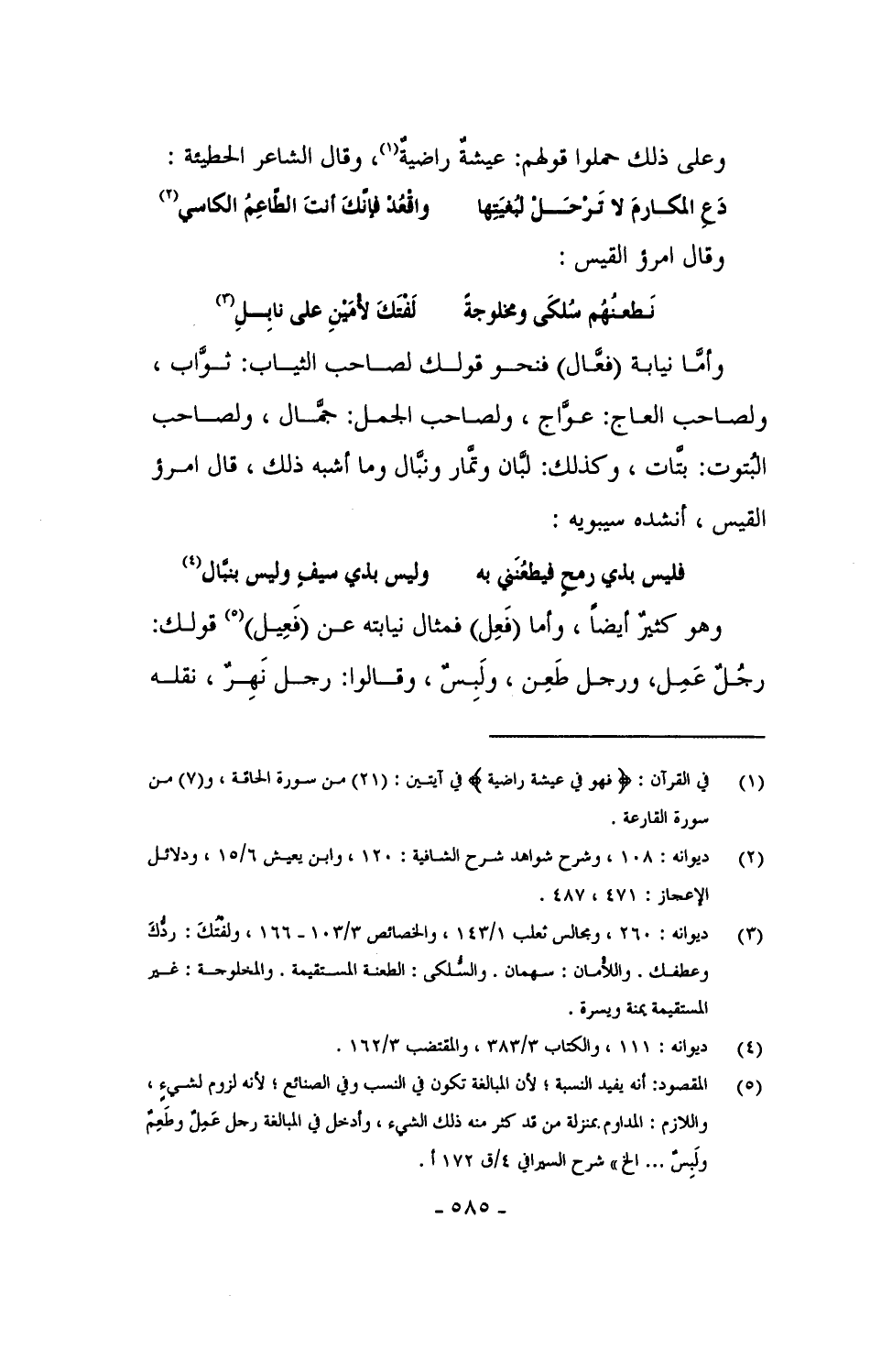 وعلى ذلك حملوا قولهم: عيشةٌ راضيةٌ، وقال الشاعر الحطيئة:
