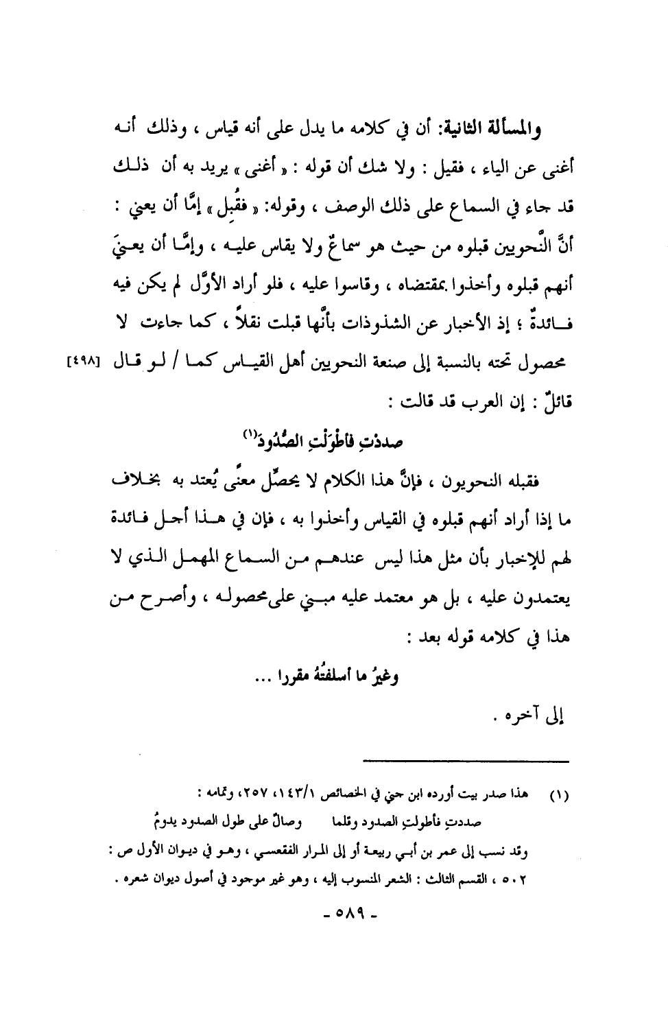 والمسألة الثانية: أن في كلامه ما يدل على أنه قياس، وذلك أنه أغنى عن الياء، فقيل: ولا شك أن قوله: "أغنى" يريد به أن ذلك قد جاء في السماع على ذلك الوصف، وقوله: "فقُبِل" إمَّا أن يعني: أنَّ النحويين قبلوه من حيث هو سماعٌ ولا يقاس عليه، وإمَّا أن يعنيَ أنهم قبلوه وأخذوا بمقتضاه، وقاسوا عليه، فلو أراد الأول لم يكن فيه فائدةٌ؛ إذ الأخبار عن الشذوذات بأنها قبلت نقلاً، كما جاءت لا محصول تحته بالنسبة إلى صنعة النحويين أهل القياس كما / لو قال قائلٌ: إن العرب قد قالت: