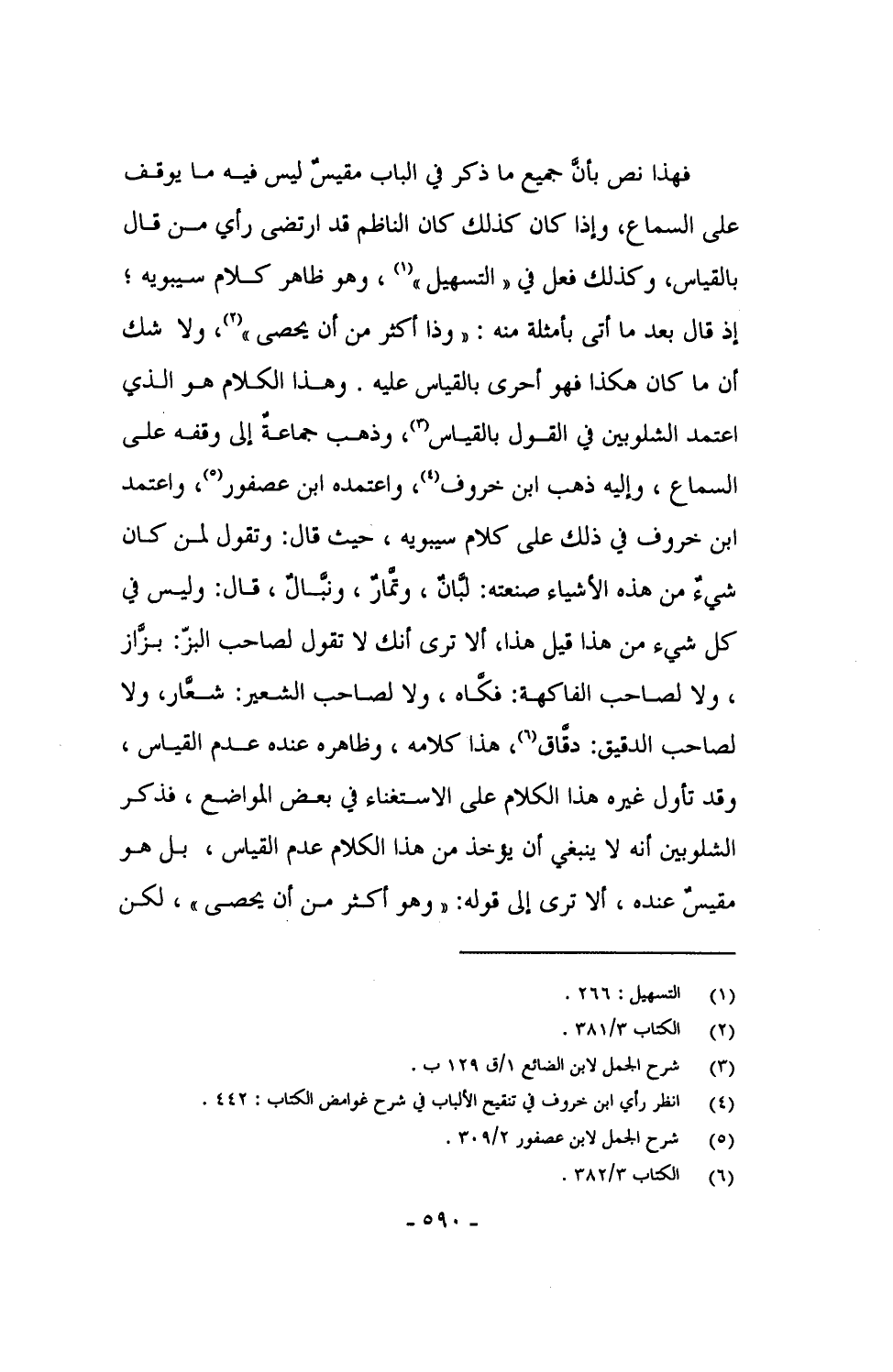 فهذا نص بأنَّ جميع ما ذكر في الباب مقيسٌ ليس فيه ما يوقف على السماع، وإذا كان كذلك كان الناظم قد ارتضى رأي من قال بالقياس، وكذلك فعل في "التسهيل"، وهو ظاهر كلام سيبويه؛ إذ قال بعد ما أتى بأمثلة منه: "وذا أكثر من أن يحصى"، ولا شك أن ما كان هكذا فهو أحرى بالقياس عليه. وهذا الكلام هو الذي اعتمد الشلوبين في القول بالقياس، وذهب جماعةٌ إلى وقفه على السماع، وإليه ذهب ابن خروف، واعتمده ابن عصفور، واعتمد ابن خروف في ذلك على كلام سيبويه، حيث قال: وتقول لمن كان شيءٌ من هذه الأشياء صنعته: لبَّانٌ، وتمَّارٌ، ونبَّالٌ، قال: وليس في كل شيء من هذا قيل هذا، ألا ترى أنك لا تقول لصاحب البزّ: بزّاز، ولا لصاحب الفاكهة: فكَّاه، ولا لصاحب الشعير: شعَّار، ولا لصاحب الدقيق: دقَّاق، هذا كلامه، وظاهره عنده عدم القياس، وقد تأول غيره هذا الكلام على الاستغناء في بعض المواضع، فذكر الشلوبين أنه لا ينبغي أن يؤخذ من هذا الكلام عدم القياس، بل هو مقيسٌ عنده، ألا ترى إلى قوله: "وهو أكثر من أن يحصى"، لكن