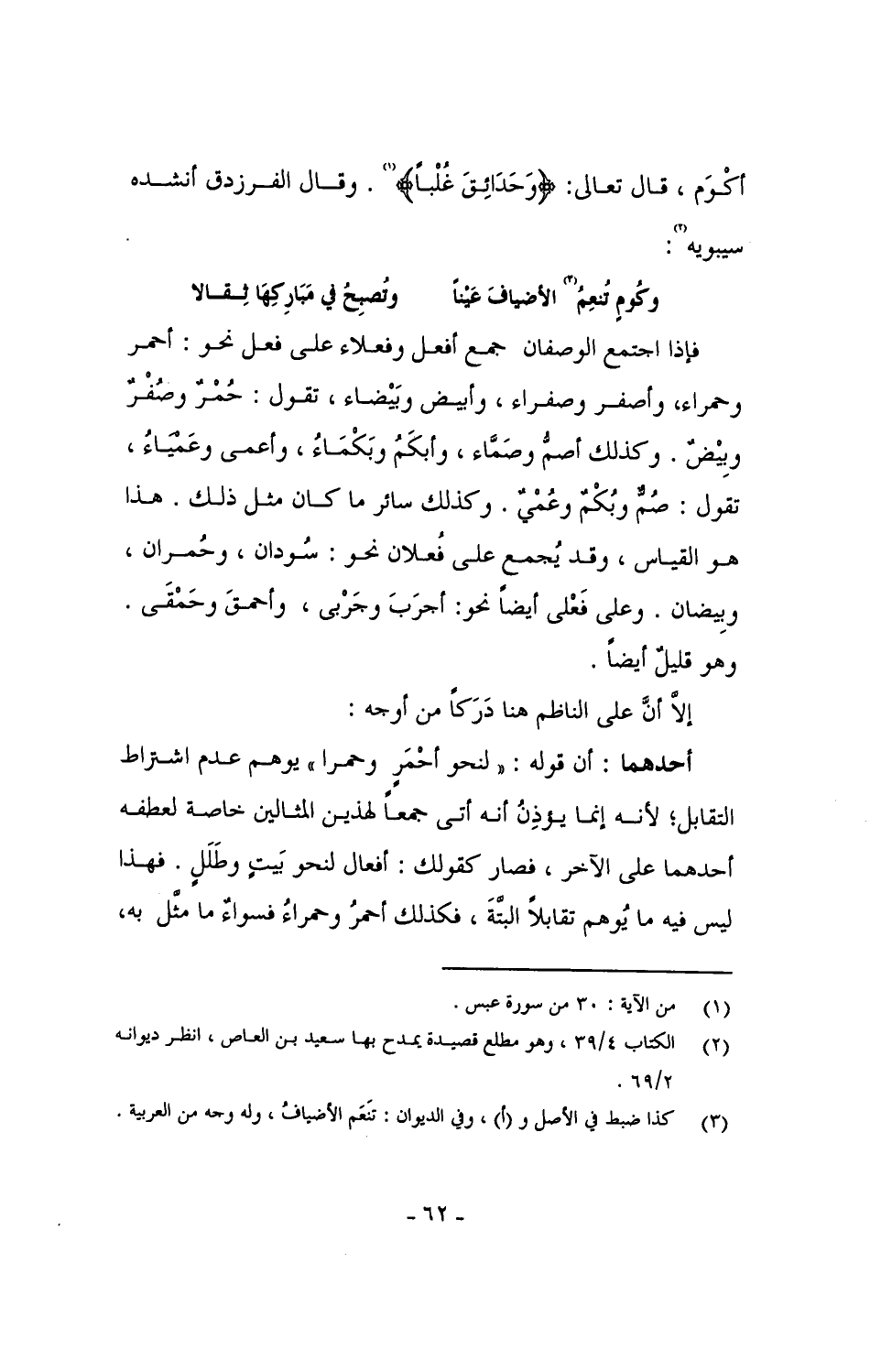 فإذا اجتمع الوصفان جمع أفعل وفعلاء على فعل نحو: أحمر وحمراء، وأصفر وصفراء، وأبيض وبيضاء، تقول: حُمْرٌ وصُفْرٌ وبيضٌ. وكذلك أصمُّ وصمَّاء، وأبكَمُ وبكماء، وأعمى وعمياء، تقول: صمٌّ وبُممٌ وعُمْيٌ. وكذلك سائر ما كان مثل ذلك. هذا هو القياس، وقد يجمع على فعلان نحو: سودان، وحمران، وبيضان. وعلى فُعْلى أيضاً نحو: أجرب وجرْبى، وأحمقَ وحمقى. وهو قليلٌ أيضاً.