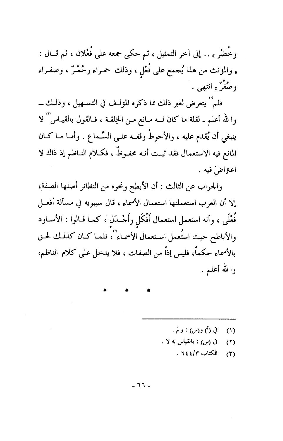 والجواب عن الثالث: أن الأبطح ونحوه من النظائر أصلها الصفة، إلا أن العرب استعملتها استعمال الأسماء، قال سيبويه في مسألة أفعل فُعْلَى، وأنه استعمل استعمال أَفْكَلٍ وأجْدَلٍ، كما قالوا: الأساود والأباطح حيث استعمل استعمال الأسماء، فلما كان كذلك الحق بالأسماء حكماً، فليس إذاً من الصفات، فلا يدخل على كلام الناظم، والله أعلم.
