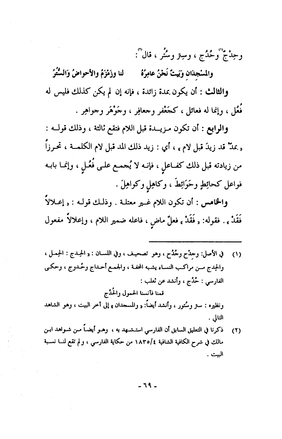 والثالث: أن يكون بمدة زائدة، فإنه إن لم يكن كذلك فليس له فُعُل، وإنما له فعائل، كجعفر وجعافر، وجوهر وجواهر.