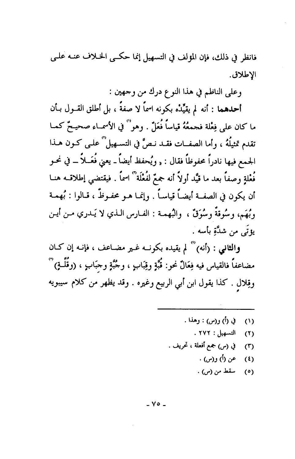أحدهما: أنه لم يقيِّدْه بكونه اسماً لا صفةً، بل أطلق القول بأن ما كان على فِعْلة فجمعُهُ قياساً فُعَلٌ. وهو في الأسماء صحيحٌ كما تقدم تمثيلُهُ، وأما الصفات فقد نصَّ في التسهيل على كون هذا الجمع فيها نادراً محفوظاً فقال: "ويُحفظ أيضاً - يعني فُعَلاً - في نحو فُعْلةٍ وصفاً بعد ما قيَّد أولاً أنه جمعٌ لفُعْلَة اسماً. فيقتضي إطلاقه هنا أن يكون في الصفة أيضاً قياساً. وإنما هو محفوظٌ، قالوا: بُهمة وبُهَم، وسُوقةٌ وسُوَقٌ، والبُهمة: الفارس الذي لا يدري من أين يؤتى من شدة بأسه.