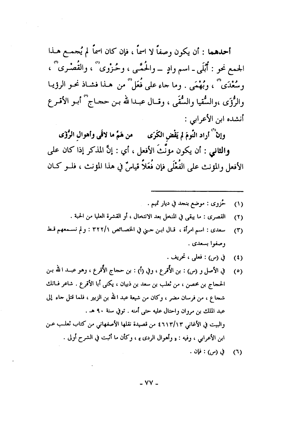 أحدهما: أن يكون وصفاً لا اسماً، فإن كان اسماً لم يُجمع هذا الجمع نحو: أُبُلَى - اسم وادٍ - والحمّى، وحُزْوى، والقصوى، وسُعدى، وبُهمى. وما جاء على فُعَل من هذا فشاذ نحو الرؤيا والرؤَى والسقيا والسقى، وقال عبدالله بن حجاج أبو الأقرع أنشده ابن الأعرابي:
