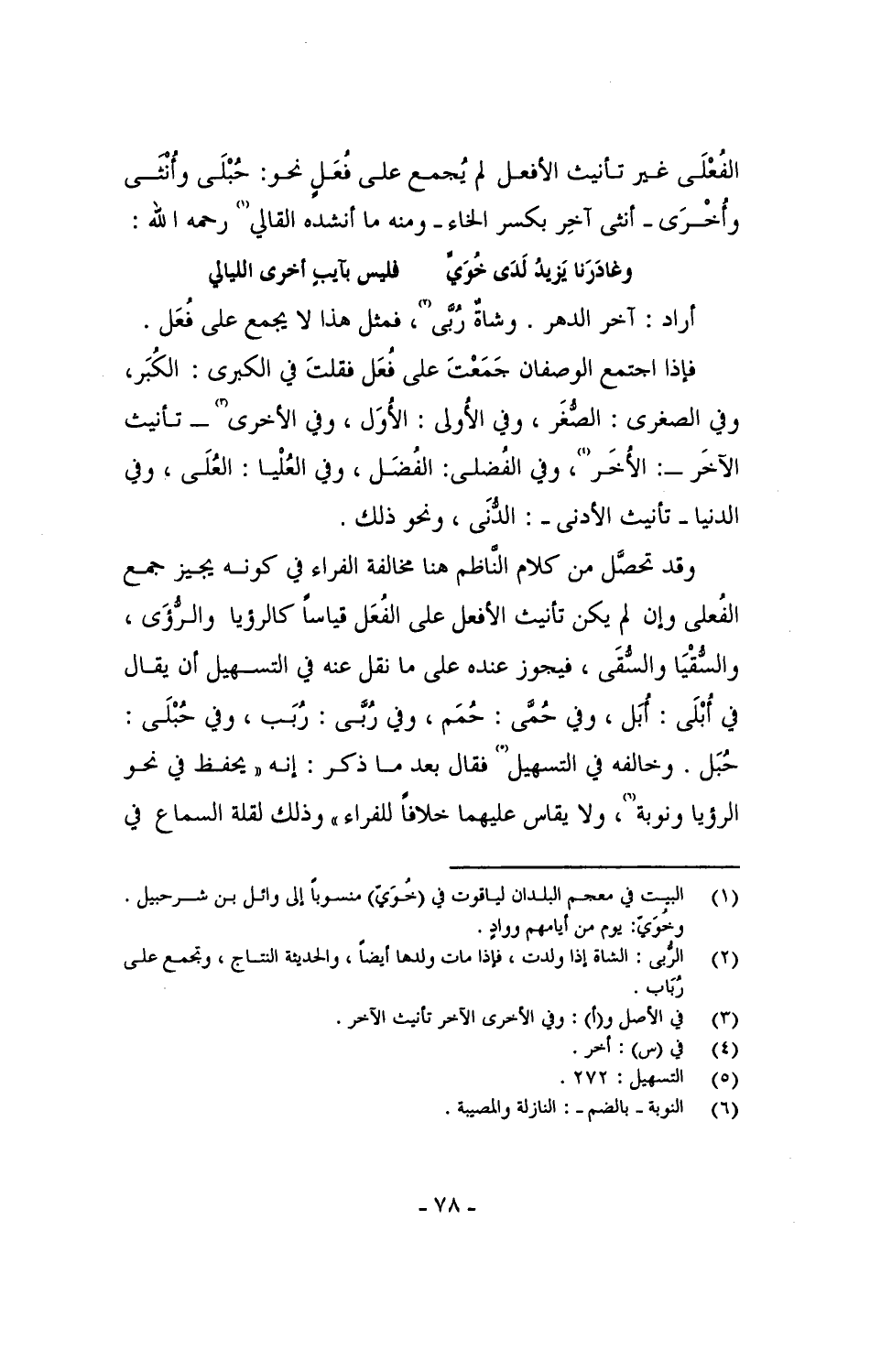 الفُعْلى غير تأنيث الأفعل لم يُجمع على فُعَل نحو: حُبْلَى وأنثى وأخرى - أنثى آخر بكسر الخاء - ومنه ما أنشده القالي رحمه الله: