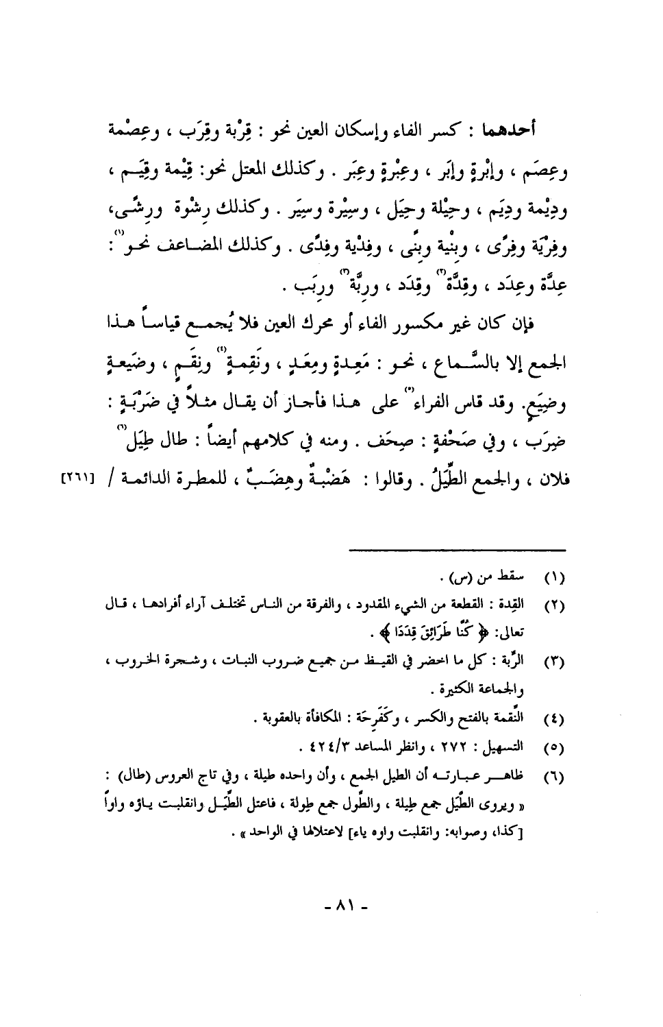 فإن كان غير مكسور الفاء أو محرك العين فلا يُجمع قياساً هذا الجمع إلا بالسماع، نحو: مَعِدةٍ ومِعَدٍ، ونقمة ونقم، وضيعة وضيع، وقد قاس الفراء على هذا فأجاز أن يقال مثلاً في ضَرْبَة: ضِرَب، وفي صَحْفَةٍ: صِحَف. ومنه في كلامهم أيضاً: طال طِيَل فلان، والجمع الطِّيَلُ. وقالوا: هَضْبةٌ وهِضَبٌ، للمطرة الدائمة /