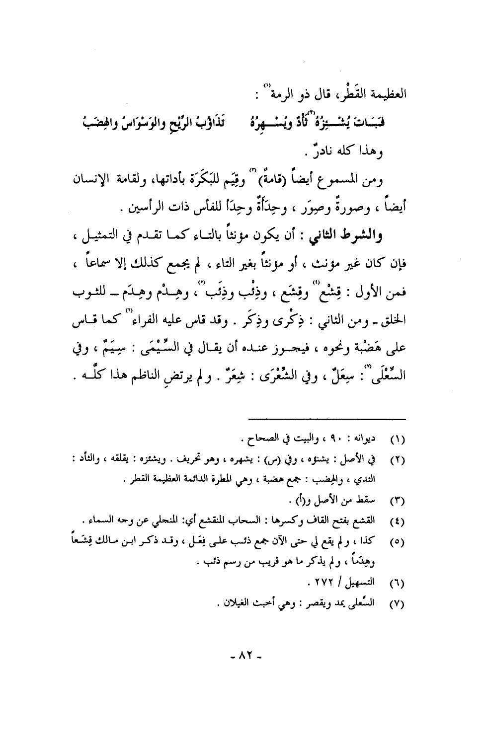 والشرط الثاني: أن يكون مؤنثاً بالتاء كما تقدم في التمثيل، فإن كان غير مؤنث، أو مؤنثاً بغير التاء، لم يجمع كذلك إلا سماعاً، فمن الأول: قِشْع وقِشَع، وذِئْب وذِئَب، وهِدْم وهِدَم - للثوب الخلق - ومن الثاني: ذِكْرى وذِكَر. وقد قاس عليه الفراء كما قاس على هَضْبة ونحوه، فيجوز عنده أن يقال في السِّيْمَى: سِيَمٌ، وفي السِّعْلَى: سِعَلٌ، وفي الشِّعْرَى شِعَرٌ. ولم يرتضِ الناظ هذا كلَّه.