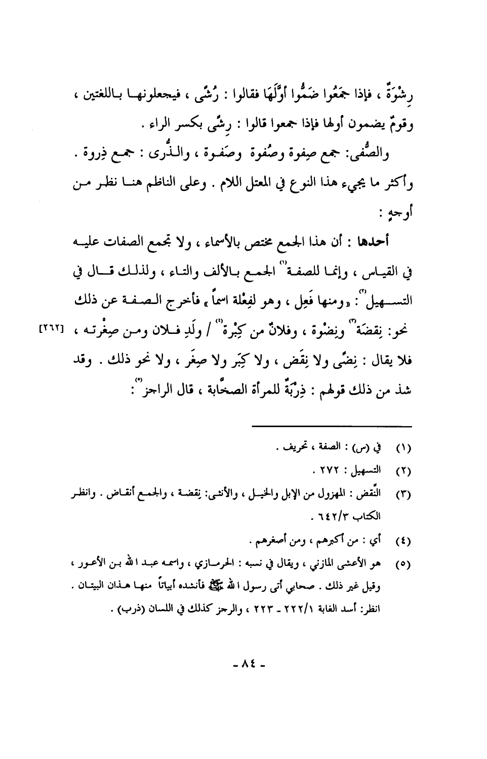 والصفى: جمع صِفوة وصَفوة، والذُّرى جع ذِروة. وأكثر ما يجيء هذا النوع في المعتل اللام. وعلى الناظم هنا نظر من أوجهٍ: