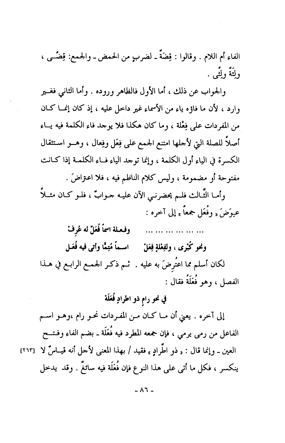 والجواب عن ذلك، أما الأول فالظاهر وروده. وأما الثاني فغير وارد، لأن ما فاؤه ياء من الأسماء غير داخل عليه، إذ كان إنما كان من المفردات على فِعْلة، وما كان هكذا فلا يوجد فاء الكلمة فيه ياء أصلاً للصلة التي لأجلها امتنع الجمع على فِعَل وفِعال، وهو استثقال الكسرة في الياء أول الكلمة، وإنما توجد الياء فاء الكلمة إذا كانت مفتوحة أو مضمومة، وليس كلام الناظم فيه، فلا اعتراضَ.