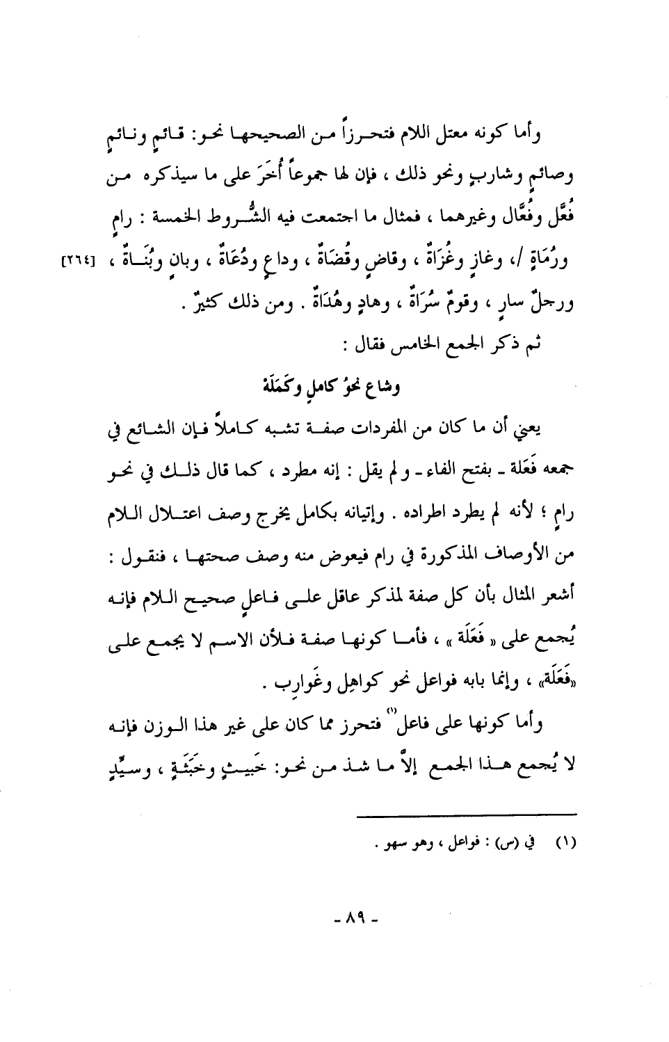 يعني أن ما كان من المفردات صفة تشبه كاملاً فإن الشائع في جمعه فَعَلة - بفتح الفاء - ولم يقل: إنه مطرد، كما قال ذلك في نحو رامٍ؛ لأنه لم يطرد اطراده. وإتيانه بكامل يخرج وصف اعتلال اللام من الأوصاف المذكورة في رام فيعوض منه وصف صحتها، فنقول: أشعر المثال بأن كل صفة لمذكر عاقل على فاعلٍ صحيح اللام فإنه يجمع على "فَعَلَة"، فأما كونها صفة فلأن الاسم لا يجمع على "فَعَلَة"، وإنما بابه فواعل نحو كواهل وغوارب.