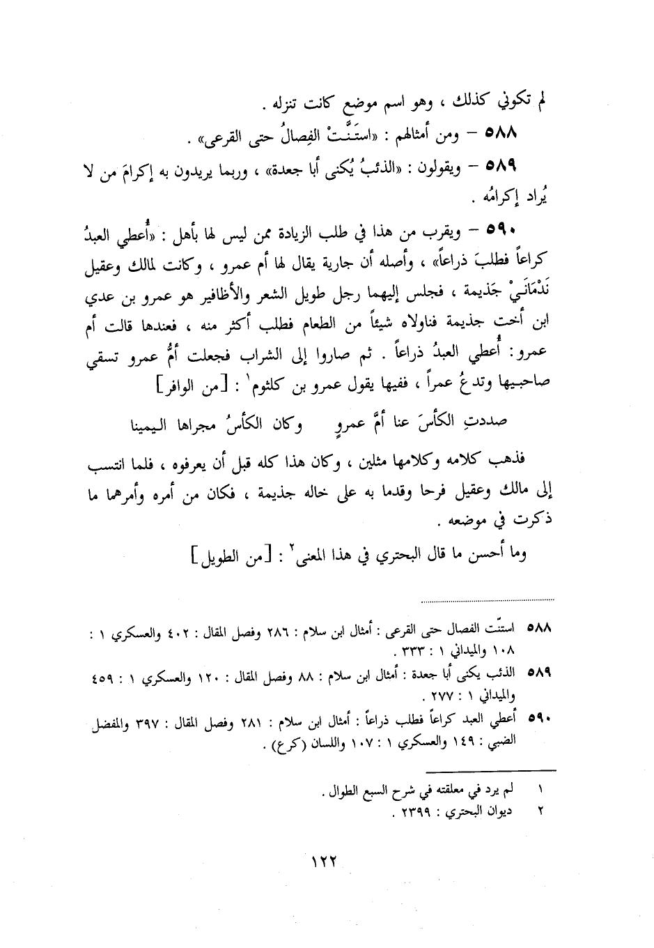«590» - ويقرب من هذا في طلب الزيادة ممن ليس لها بأهل: «أعطي العبد كراعا فطلب ذراعا» ، وأصله أن جارية يقال لها أم عمرو، وكانت لمالك وعقيل ندماني جذيمة، فجلس إليهما رجل طويل الشعر والأظافير هو عمرو بن عدي ابن أخت جذيمة فناولاه شيئا من الطعام فطلب أكثر منه، فعندها قالت أم عمرو: أعطي العبد ذراعا. ثم صاروا إلى الشراب فجعلت أمّ عمرو تسقي صاحبيها وتدع عمرا، ففيها يقول عمرو بن كلثوم [1] : [من الوافر]