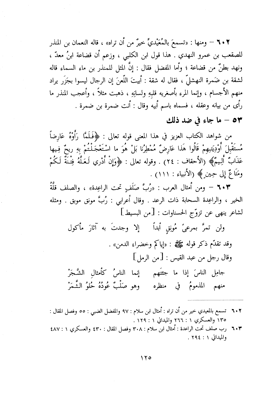 «602» - ومنها: «تسمع بالمعيديّ خير من أن تراه» ، قاله النعمان بن المنذر للصقعب بن عمرو النهدي. هذا قول ابن الكلبي، وزعم أن قضاعة ابن معدّ، ونهد بطن من قضاعة؛ وأما المفضل فقال: إنّ المثل للمنذر بن ماء السماء قاله لشقة بن ضمرة النهشليّ، فقال له شقة: أبيت اللّعن إن الرجال ليسوا بجزر يراد منهم الأجسام، وإنما المرء بأصغريه قلبه ولسانه، ذهبت مثلا، وأعجب المنذر ما رأى من بيانه وعقله، فسماه باسم أبيه وقال: أنت ضمرة بن ضمرة.