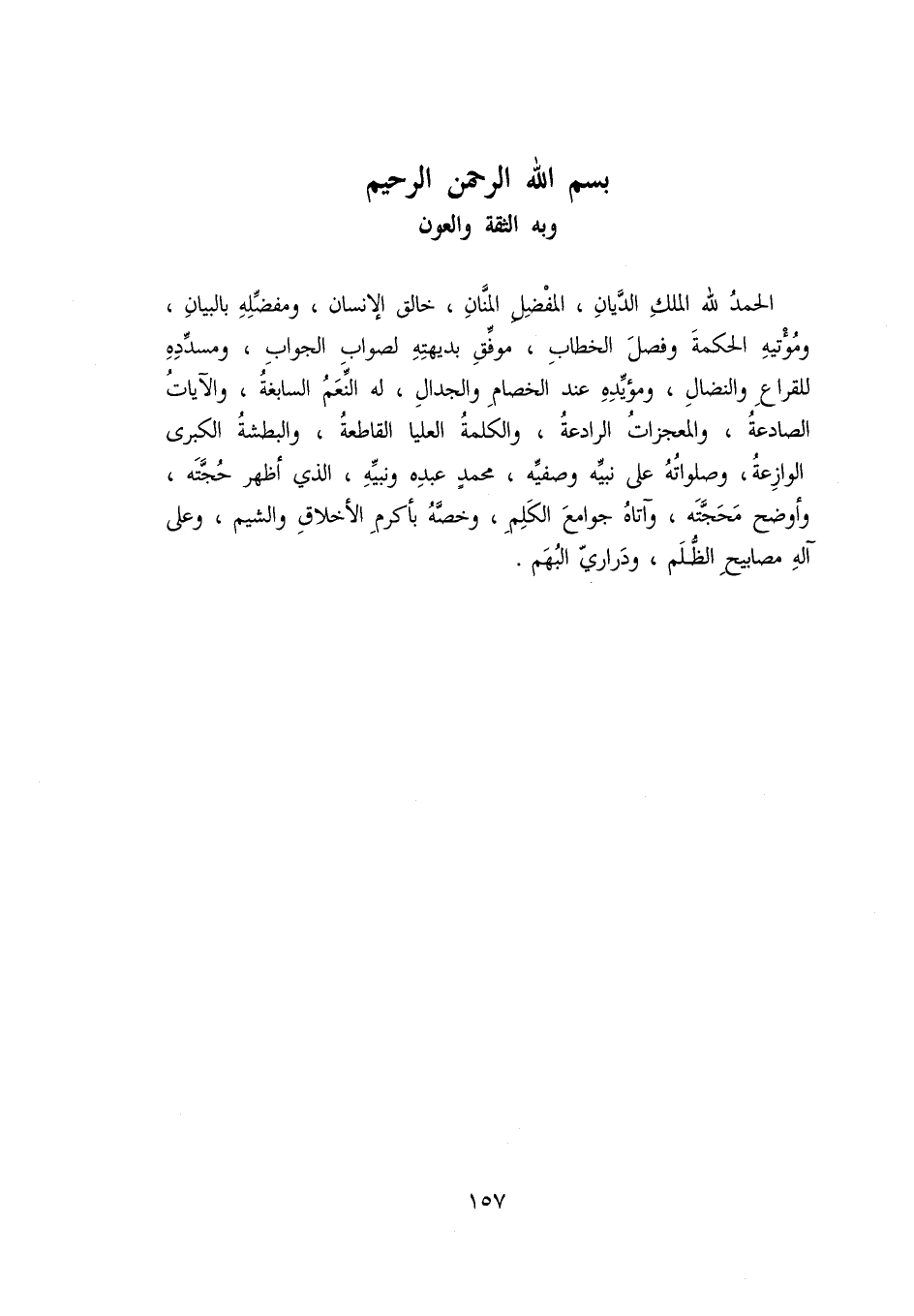 وبه الثقة والعون الحمد لله الملك الدّيان، المفضل المنّان، خالق الإنسان، ومفضّله بالبيان، ومؤتيه الحكمة وفصل الخطاب، موفّق بديهته لصواب الجواب، ومسدّده للقراع والنضال، ومؤيّده عند الخصام والجدال، له النّعم السابغة، والآيات الصادعة، والمعجزات الرادعة، والكلمة العليا القاطعة، والبطشة الكبرى الوازعة، وصلواته على نبيّه وصفيّه، محمد عبده ونبيّه، الذي أظهر حجّته، وأوضح محجّته، وآتاه جوامع الكلم، وخصّه بأكرم الأخلاق والشيم، وعلى آله مصابيح الظّلم، ودراريّ البهم.
