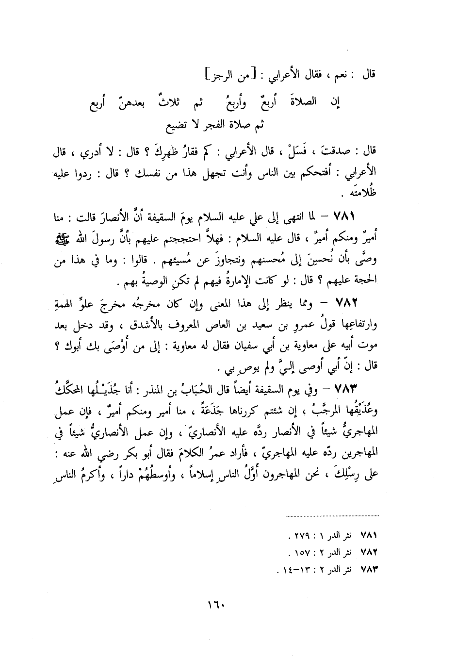 «781» - لما انتهى إلى علي عليه السلام يوم السقيفة أنّ الأنصار قالت: منا أمير ومنكم أمير، قال عليه السلام: فهلّا احتججتم عليهم بأنّ رسول الله صلّى الله عليه وسلم وصّى بأن نحسن إلى محسنهم ونتجاوز عن مسيئهم. قالوا: وما في هذا من الحجة عليهم؟ قال: لو كانت الإمارة فيهم لم تكن الوصية بهم.