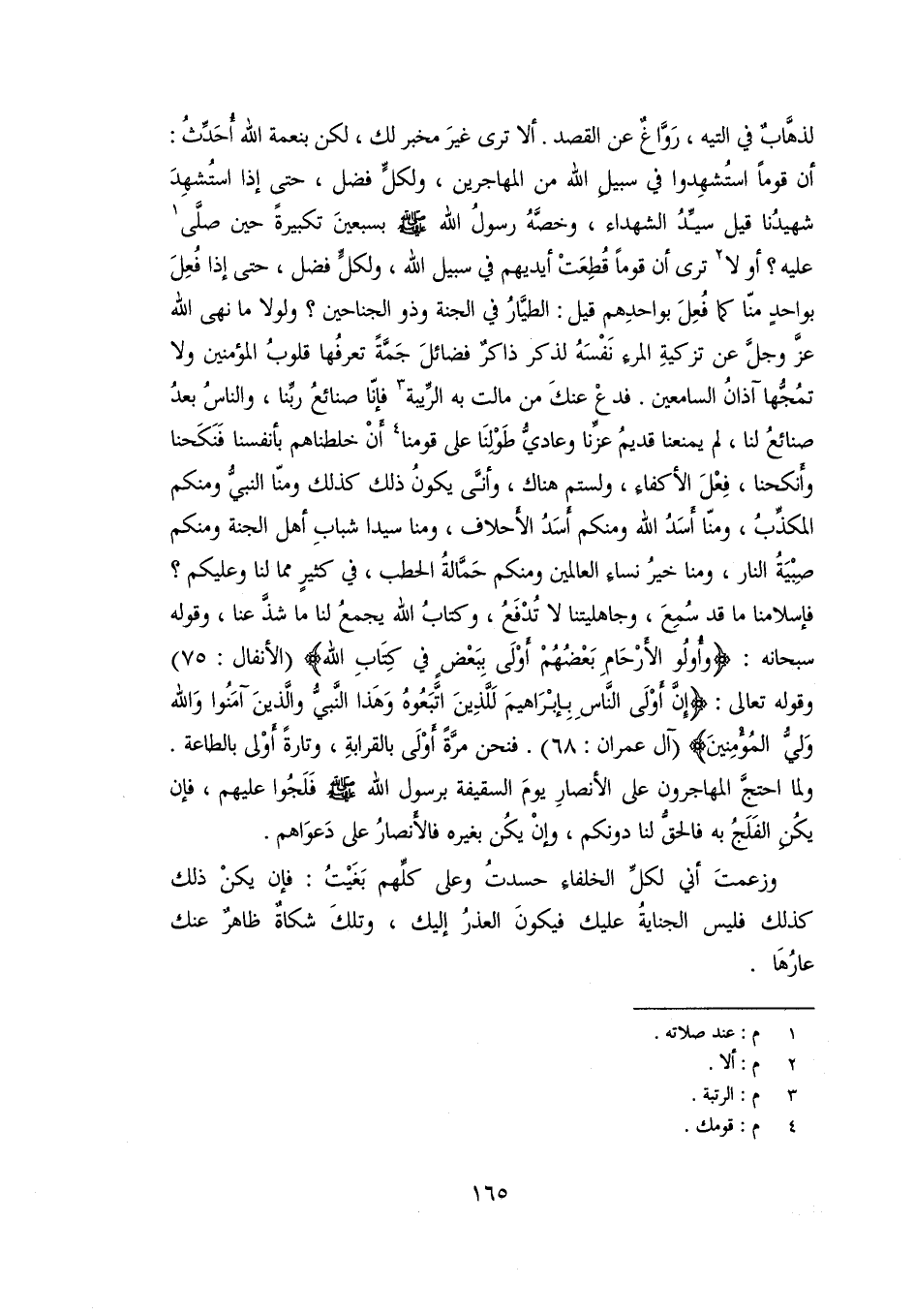 أن قوما استشهدوا في سبيل الله من المهاجرين، ولكلّ فضل، حتى إذا استشهد شهيدنا قيل سيّد الشهداء، وخصّه رسول الله صلّى الله عليه وسلم بسبعين تكبيرة حين صلّى [1] عليه؟ أو لا [2] ترى أن قوما قطعت أيديهم في سبيل الله، ولكلّ فضل، حتى إذا فعل بواحد منّا كما فعل بواحدهم قيل: الطيّار في الجنة وذو الجناحين؟ ولولا ما نهى الله عزّ وجلّ عن تزكية المرء نفسه لذكر ذاكر فضائل جمّة تعرفها قلوب المؤمنين ولا تمجّها آذان السامعين. فدع عنك من مالت به الرّيبة [3] فإنّا صنائع ربّنا، والناس بعد صنائع لنا، لم يمنعنا قديم عزّنا وعاديّ طولنا على قومنا [4] أن خلطناهم بأنفسنا فنكحنا وأنكحنا، فعل الأكفاء، ولستم هناك، وأنّى يكون ذلك كذلك ومنّا النبيّ ومنكم المكذّب، ومنّا أسد الله ومنكم أسد الأحلاف، ومنا سيدا شباب أهل الجنة ومنكم صبية النار، ومنا خير نساء العالمين ومنكم حمّالة الحطب، في كثير مما لنا وعليكم؟