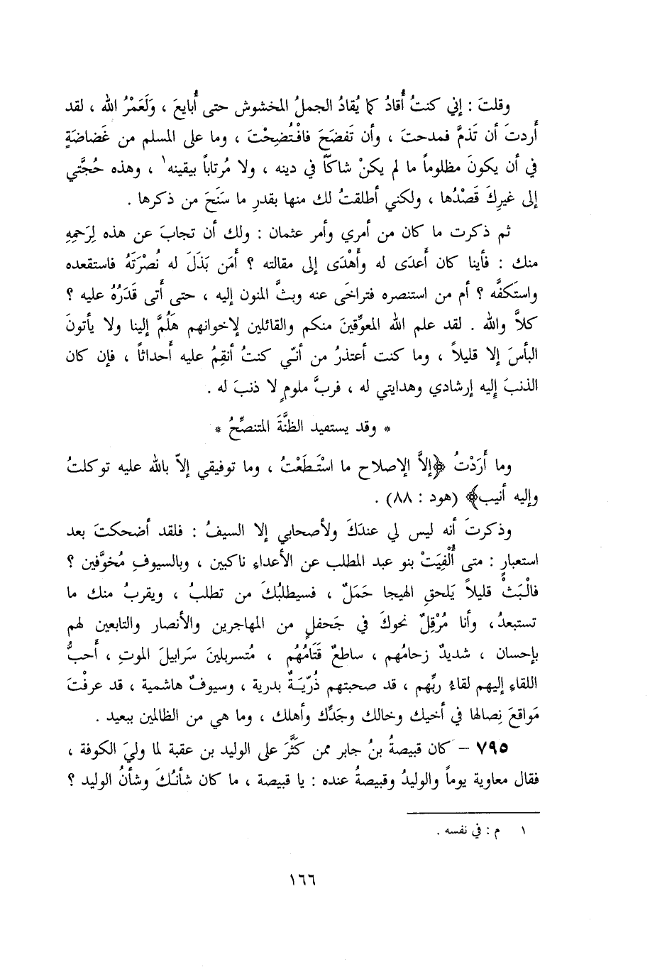 وقلت: إني كنت أقاد كما يقاد الجمل المخشوش حتى أبايع، ولعمر الله، لقد أردت أن تذمّ فمدحت، وأن تفضح فافتضحت، وما على المسلم من غضاضة في أن يكون مظلوما ما لم يكن شاكا في دينه، ولا مرتابا بيقينه [1] ، وهذه حجّتي إلى غيرك قصدها، ولكني أطلقت لك منها بقدر ما سنح من ذكرها.