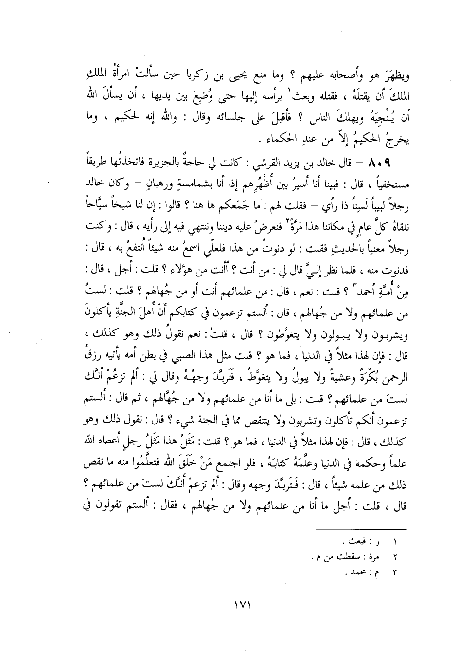 809- قال خالد بن يزيد القرشي: كانت لي حاجة بالجزيرة فاتخذتها طريقا مستخفيا، قال: فبينا أنا أسير بين أظهرهم إذا أنا بشمامسة ورهبان- وكان خالد رجلا لبيبا لسنا ذا رأي- فقلت لهم: ما جمعكم ها هنا؟ قالوا: إن لنا شيخا سيّاحا نلقاه كلّ عام في مكاننا هذا مرّة [2] فنعرض عليه ديننا وننتهي فيه إلى رأيه، قال: وكنت رجلا معنيا بالحديث فقلت: لو دنوت من هذا فلعلّي اسمع منه شيئا أنتفع به، قال: