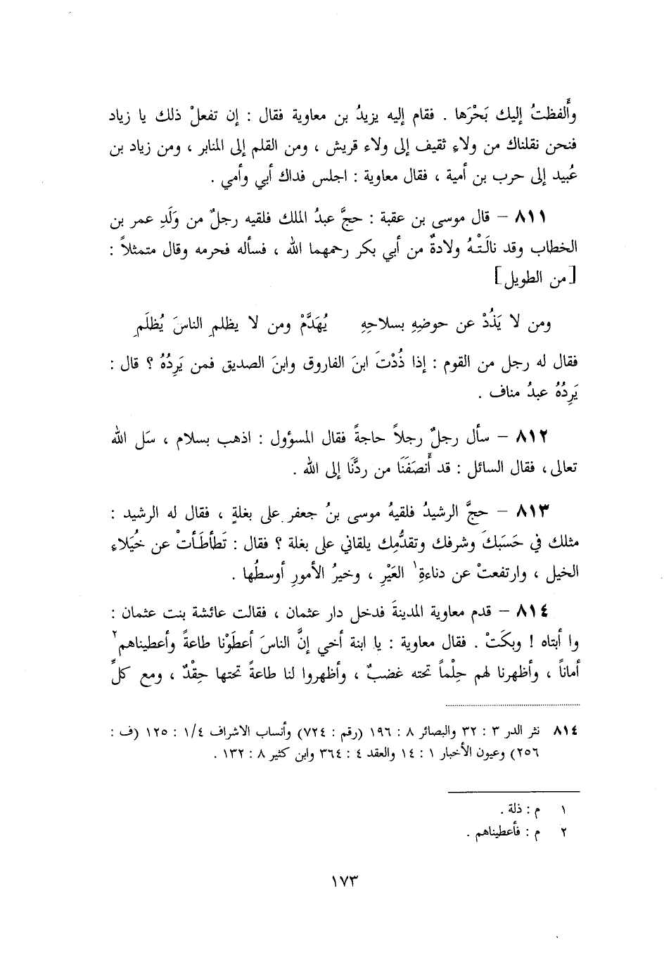811- قال موسى بن عقبة: حجّ عبد الملك فلقيه رجل من ولد عمر بن الخطاب وقد نالته ولادة من أبي بكر رحمهما الله، فسأله فحرمه وقال متمثلا: