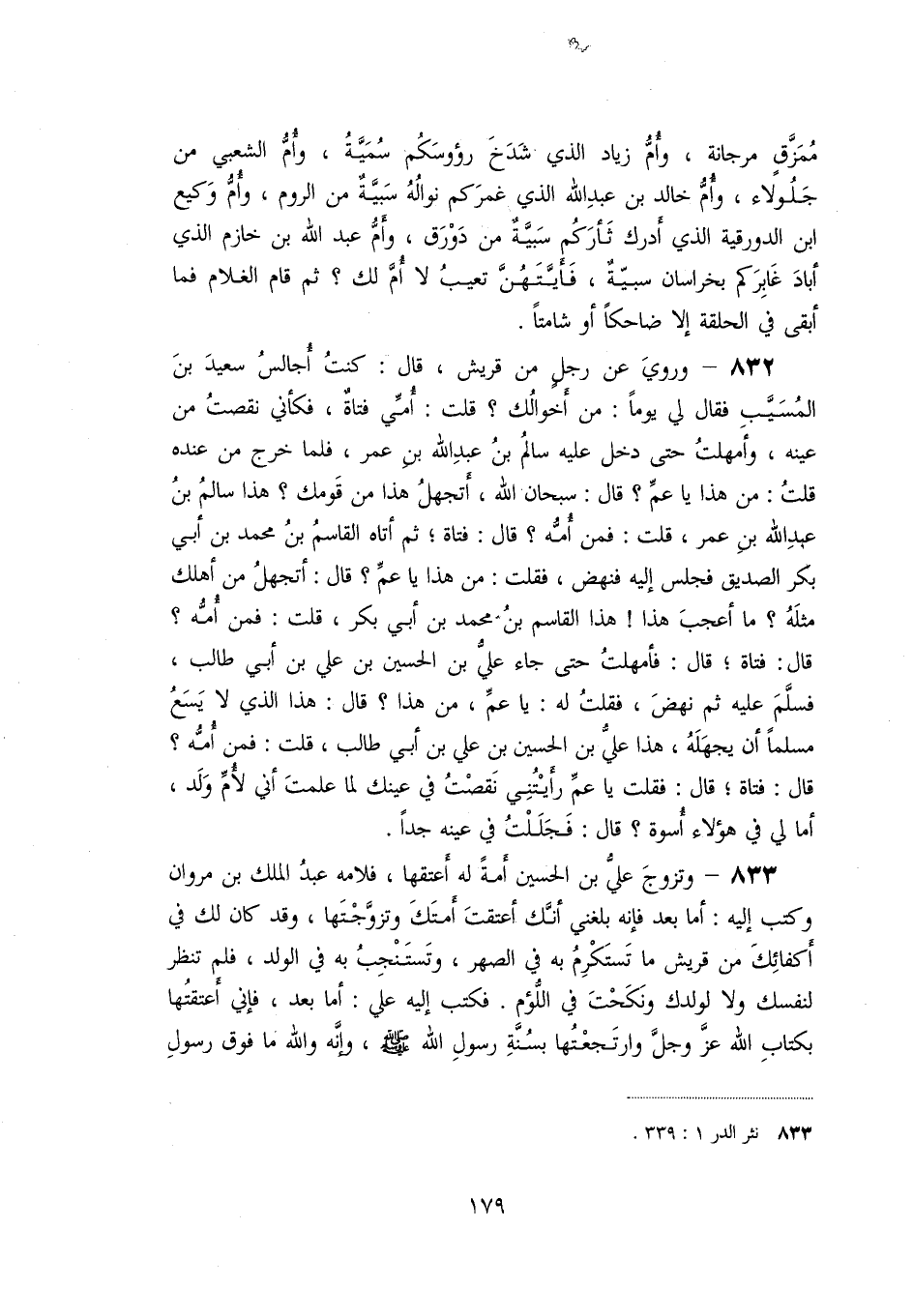 832- وروي عن رجل من قريش، قال: كنت أجالس سعيد بن المسيّب فقال لي يوما: من أخوالك؟ قلت: أمّي فتاة، فكأني نقصت من عينه، وأمهلت حتى دخل عليه سالم بن عبد الله بن عمر، فلما خرج من عنده قلت: من هذا يا عمّ؟ قال: سبحان الله، أتجهل هذا من قومك؟ هذا سالم بن عبد الله بن عمر، قلت: فمن أمّه؟ قال: فتاة؛ ثم أتاه القاسم بن محمد بن أبي بكر الصديق فجلس إليه فنهض، فقلت: من هذا يا عمّ؟ قال: أتجهل من أهلك مثله؟ ما أعجب هذا! هذا القاسم بن محمد بن أبي بكر، قلت: فمن أمّه؟