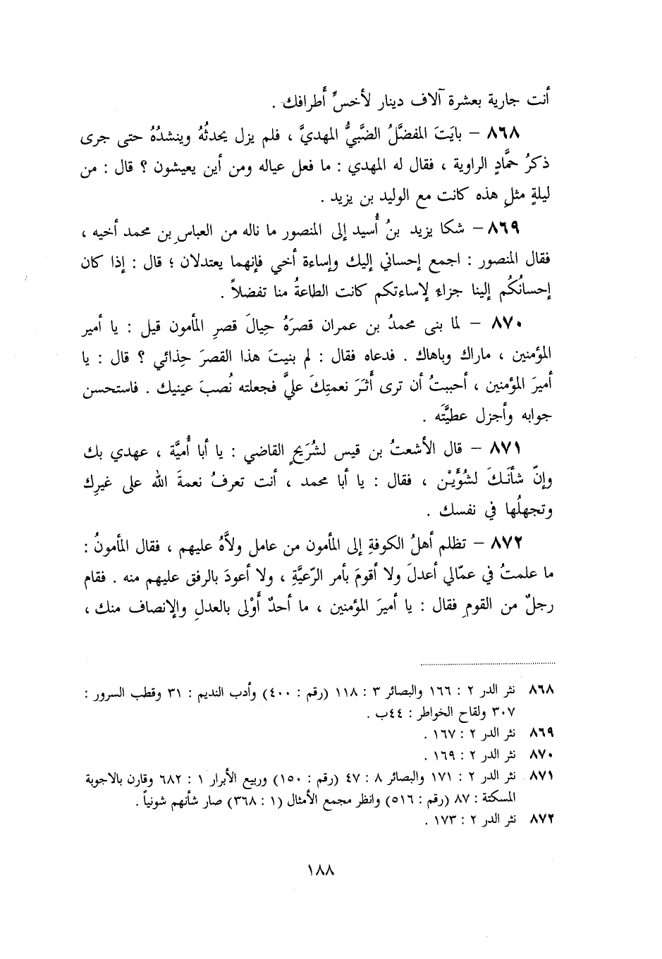 «869» - شكا يزيد بن أسيد إلى المنصور ما ناله من العباس بن محمد أخيه، فقال المنصور: اجمع إحساني إليك وإساءة أخي فإنهما يعتدلان؛ قال: إذا كان إحسانكم إلينا جزاء لإساءتكم كانت الطاعة منا تفضلا.