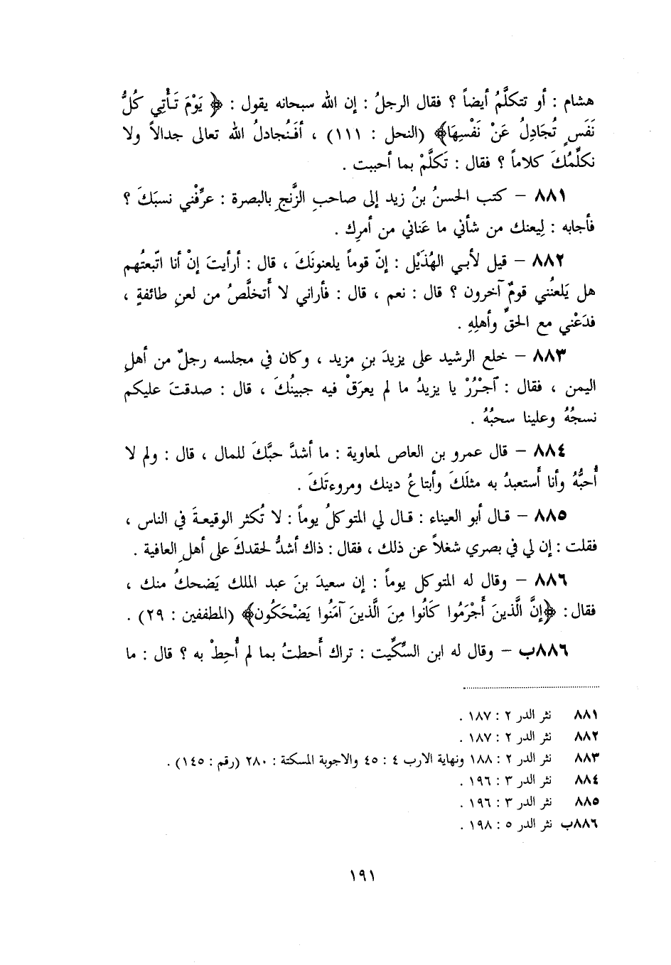 هشام: أو تتكلّم أيضا؟ فقال الرجل: إن الله سبحانه يقول: يَوْمَ تَأْتِي كُلُّ نَفْسٍ تُجادِلُ عَنْ نَفْسِها