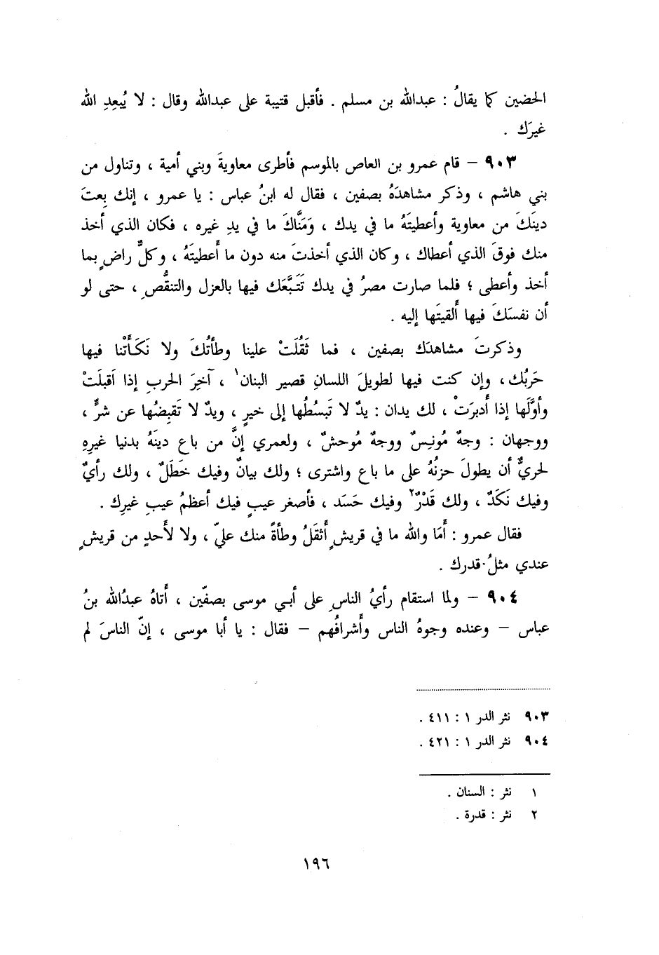 «903» - قام عمرو بن العاص بالموسم فأطرى معاوية وبني أمية، وتناول من بني هاشم، وذكر مشاهده بصفين، فقال له ابن عباس: يا عمرو، إنك بعت دينك من معاوية وأعطيته ما في يدك، ومنّاك ما في يد غيره، فكان الذي أخذ منك فوق الذي أعطاك، وكان الذي أخذت منه دون ما أعطيته، وكلّ راض بما أخذ وأعطى؛ فلما صارت مصر في يدك تتبّعك فيها بالعزل والتنقّص، حتى لو أن نفسك فيها ألقيتها إليه.