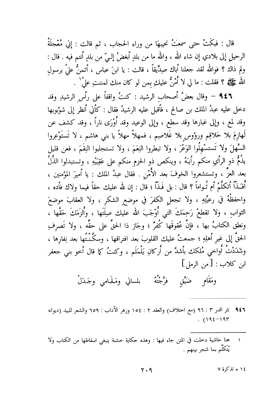 «946» - وقال بعض أصحاب الرشيد: كنت واقفا على رأس الرشيد وقد دخل عليه عبد الملك بن صالح، فأقبل عليه الرشيد فقال: كأني أنظر إلى شؤبوبها وقد لمع، وإلى غبارها وقد سطع، وإلى الوعيد وقد أورى نارا، وقد كشف عن لهازم بلا حلاقم ورؤوس بلا غلاصم، فمهلا مهلا يا بني هاشم، لا تستوعروا السّهل ولا تستسهلوا الوعر، ولا تبطروا النعم، ولا تستجلبوا النقم، فعن قليل يذمّ ذو الرأي منكم رأية، وينكص ذو الحزم منكم على عقبيه، وتستبدلوا الذّلّ بعد العزّ، وتستشعروا الخوف بعد الأمن. فقال عبد الملك: يا أمير المؤمنين، أفذّا أتكلّم أم تواما؟ قال: بل فذّا؛ قال: إن لله عليك حقا فيما ولاك فأده، واحفظه في رعيّته، ولا تجعل الكفر في موضع الشكر، ولا العقاب موضع الثواب، ولا تقطع رحمك التي أوجب الله عليك صلتها، وألزمك حقّها، ونطق الكتاب بها، فإنّ عقوقها كفر؛ وجاز ذا الحقّ على حقّه، ولا تصرف الحقّ إلى غير أهله؛ جمعت عليك القلوب بعد افتراقها، وسكّنتها بعد نفارها، وشددت أواخي ملكك بأشدّ من أركان يلملم، وكنت كما قال أخو بني جعفر ابن كلاب: [من الرمل]