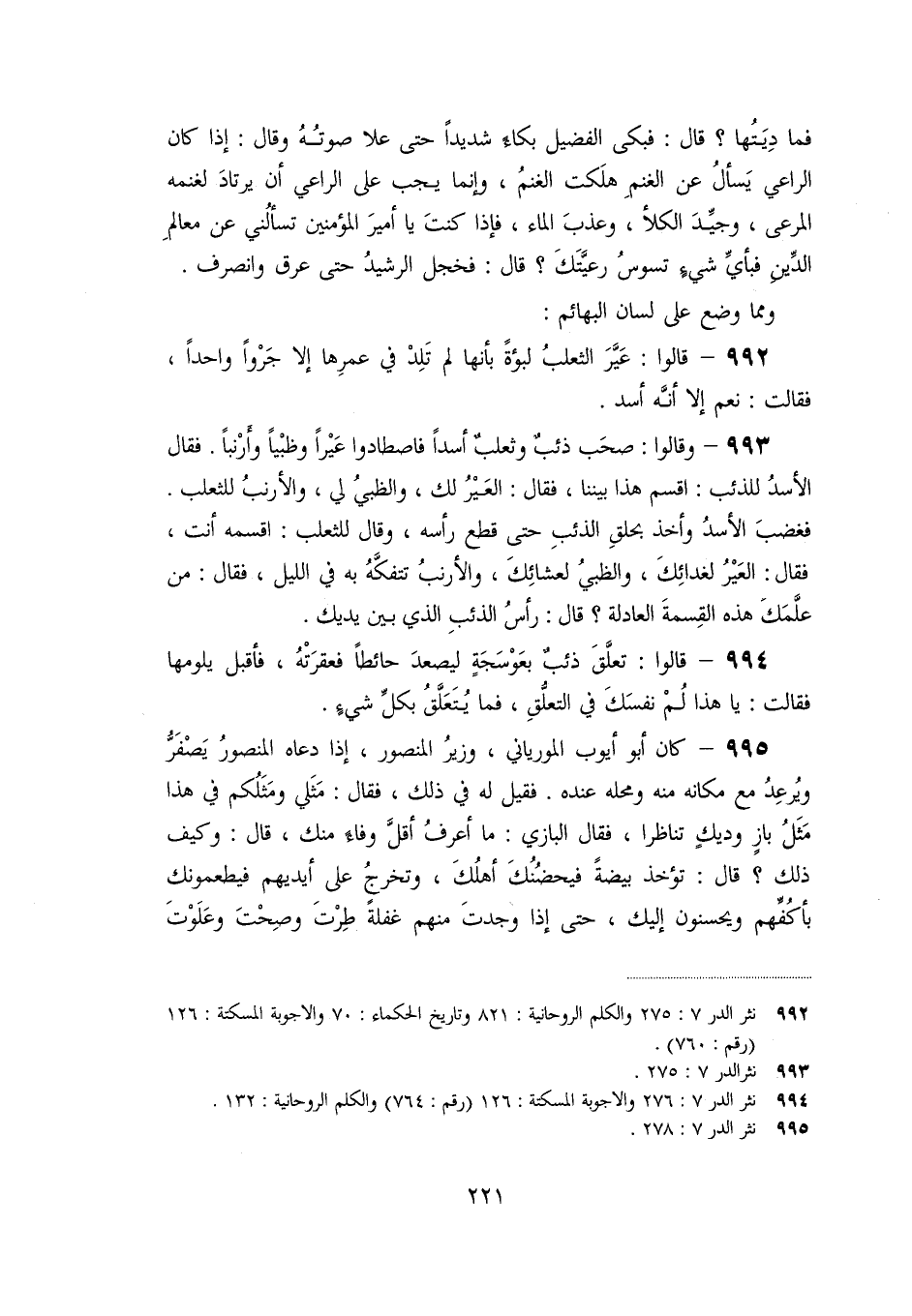 «993» - وقالوا: صحب ذئب وثعلب أسدا فاصطادوا عيرا وظبيا وأرنبا. فقال الأسد للذئب: اقسم هذا بيننا، فقال: العير لك، والظبي لي، والأرنب للثعلب.