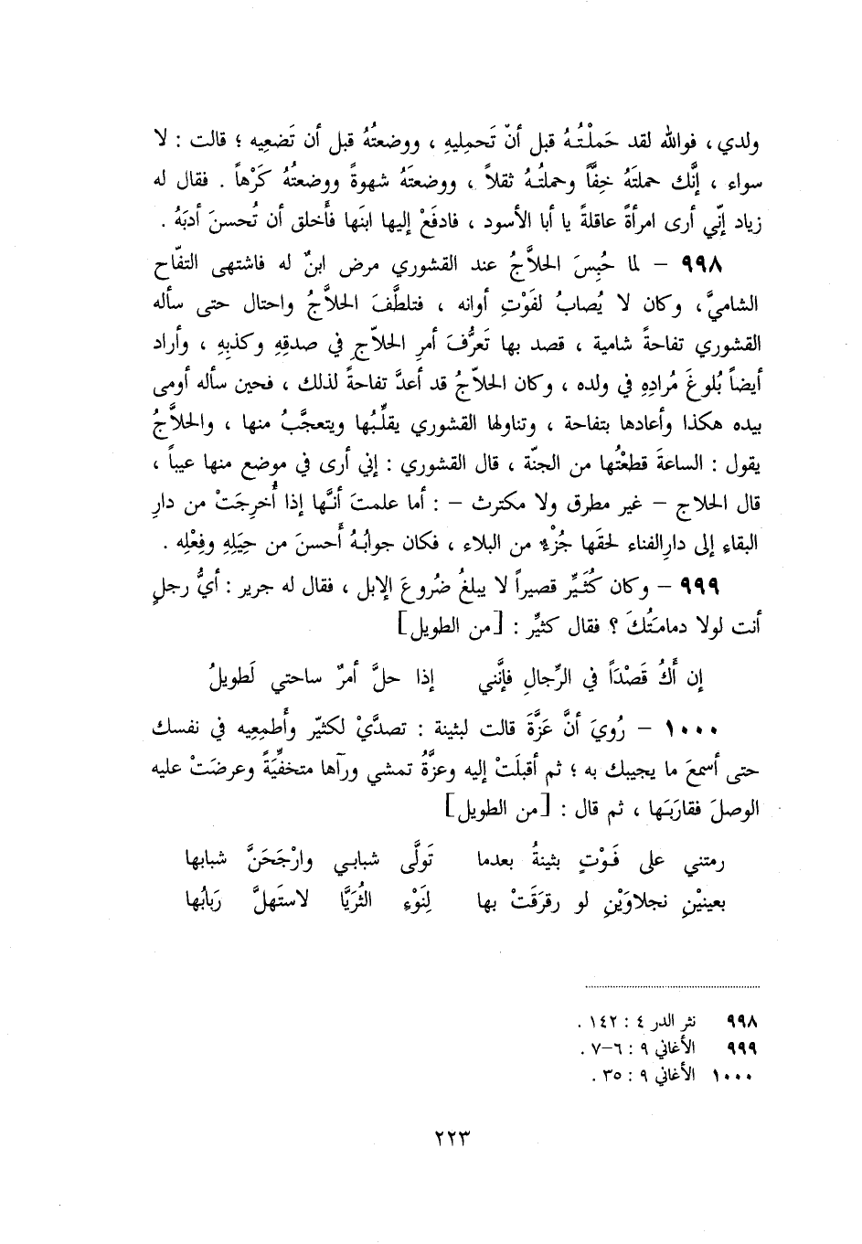 «999» - وكان كثيّر قصيرا لا يبلغ ضروع الإبل، فقال له جرير: أيّ رجل أنت لولا دمامتك؟ فقال كثيّر: [من الطويل]