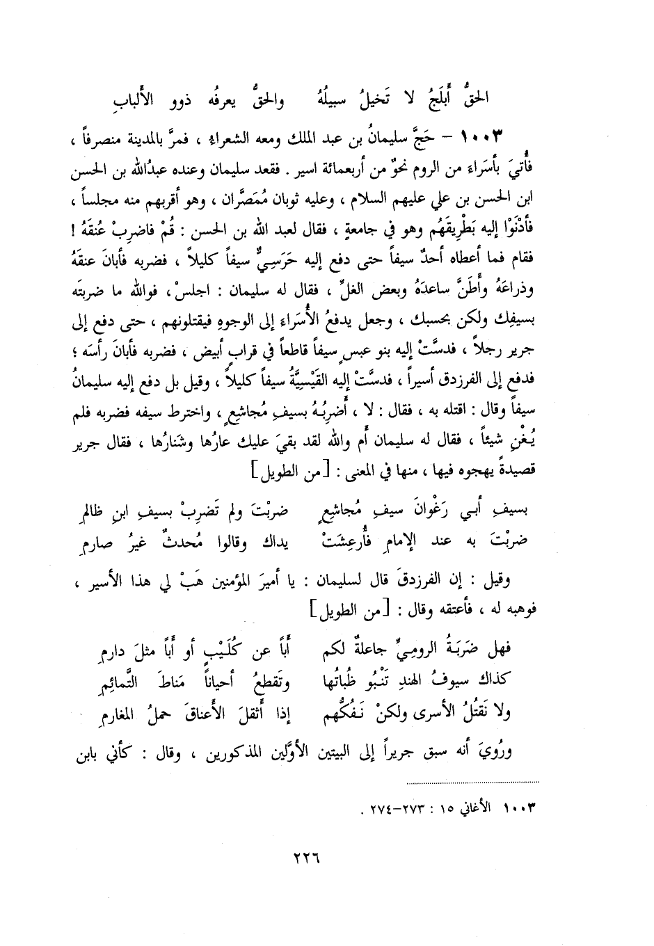 «1003» - حجّ سليمان بن عبد الملك ومعه الشعراء، فمرّ بالمدينة منصرفا، فأتي بأسراء من الروم نحو من أربعمائة اسير. فقعد سليمان وعنده عبد الله بن الحسن ابن الحسن بن علي عليهم السلام، وعليه ثوبان ممصّران، وهو أقربهم منه مجلسا، فأدنوا إليه بطريقهم وهو في جامعة، فقال لعبد الله بن الحسن: ثم فاضرب عنقه! فقام فما أعطاه أحد سيفا حتى دفع إليه حرسيّ سيفا كليلا، فضربه فأبان عنقه وذراعه وأطنّ ساعده وبعض الغلّ، فقال له سليمان: اجلس، فو الله ما ضربته بسيفك ولكن بحسبك، وجعل يدفع الأسراء إلى الوجوه فيقتلونهم، حتى دفع إلى جرير رجلا، فدسّت إليه بنو عبس سيفا قاطعا في قراب أبيض، فضربه فأبان رأسه؛ فدفع إلى الفرزدق أسيرا، فدسّت إليه القيسيّة سيفا كليلا، وقيل بل دفع إليه سليمان سيفا وقال: اقتله به، فقال: لا، أضربه بسيف مجاشع، واخترط سيفه فضربه فلم يغن شيئا، فقال له سليمان أم والله لقد بقي عليك عارها وشنارها، فقال جرير قصيدة يهجوه فيها، منها في المعنى: [من الطويل]