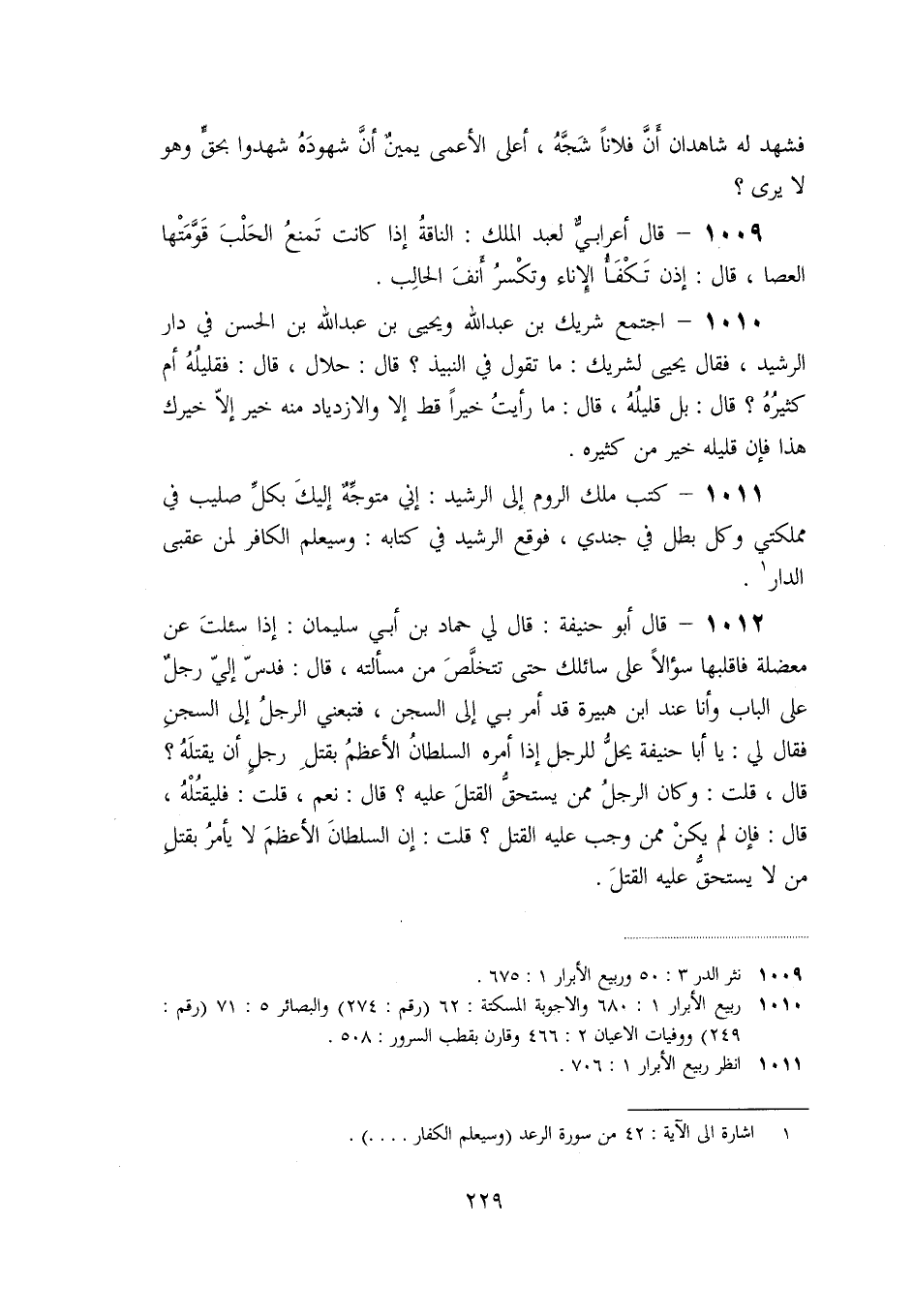 1012- قال أبو حنيفة: قال لي حماد بن أبي سليمان: إذا سئلت عن معضلة فاقلبها سؤالا على سائلك حتى تتخلّص من مسألته، قال: فدسّ إليّ رجل على الباب وأنا عند ابن هبيرة قد أمر بي إلى السجن، فتبعني الرجل إلى السجن فقال لي: يا أبا حنيفة يحلّ للرجل إذا أمره السلطان الأعظم بقتل رجل أن يقتله؟