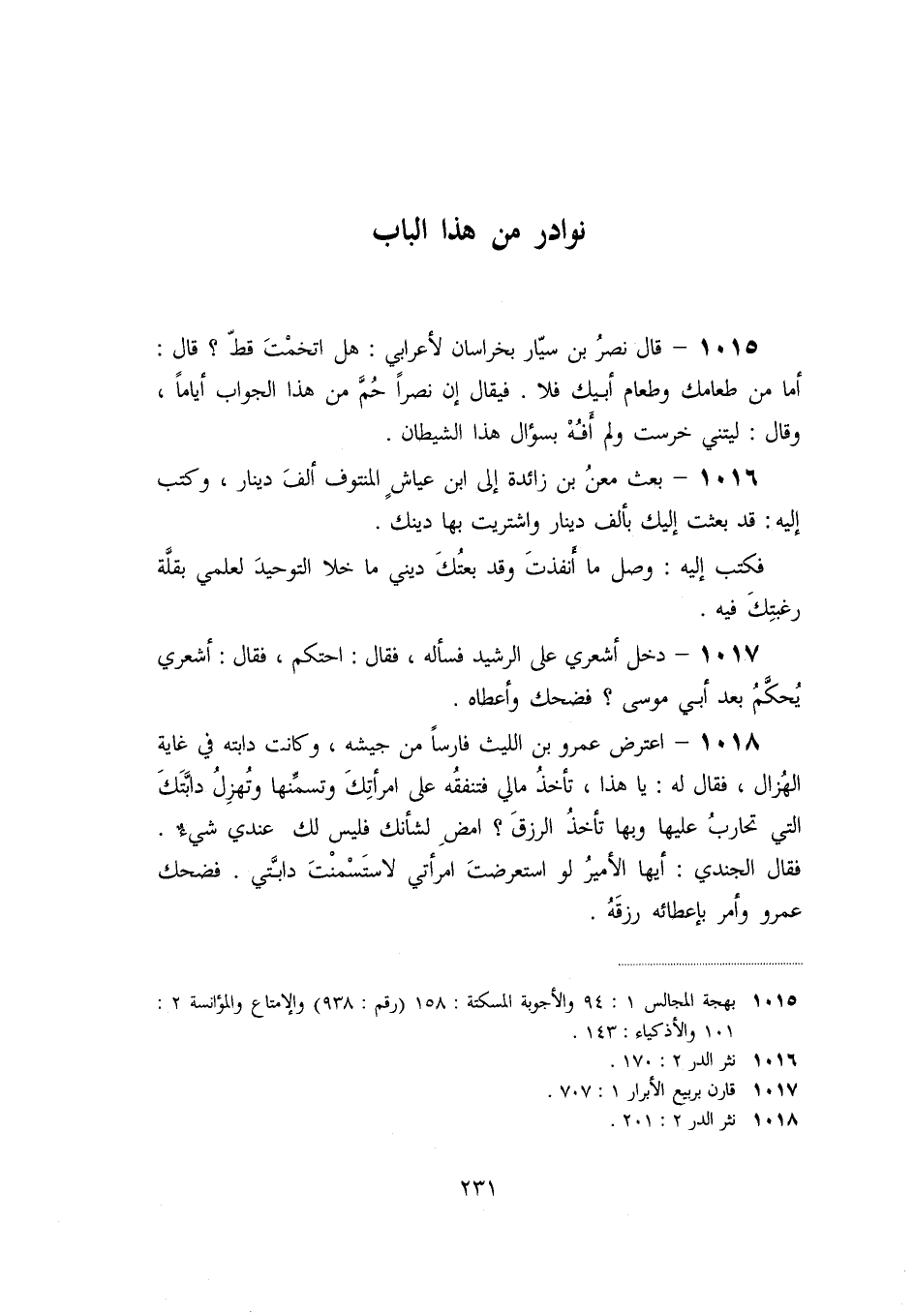«1017» - دخل أشعري على الرشيد فسأله، فقال: احتكم، فقال: أشعري يحكّم بعد أبي موسى؟ فضحك وأعطاه.