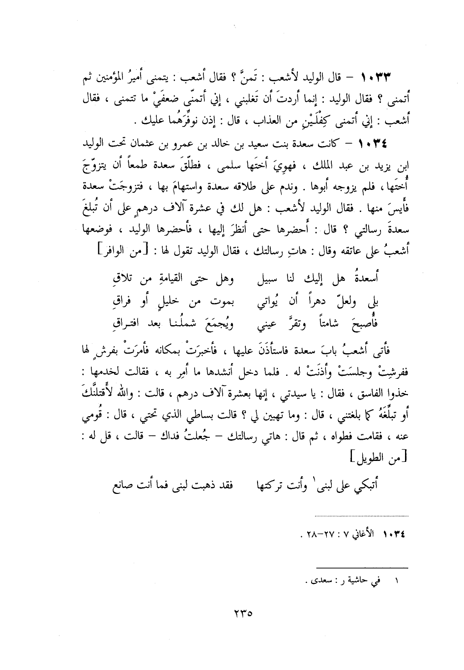 «1034» - كانت سعدة بنت سعيد بن خالد بن عمرو بن عثمان تحت الوليد ابن يزيد بن عبد الملك، فهوي أختها سلمى، فطلّق سعدة طمعا أن يتزوّج أختها، فلم يزوجه أبوها. وندم على طلاقه سعدة واستهام بها، فتزوجت سعدة فأيس منها. فقال الوليد لأشعب: هل لك في عشرة آلاف درهم على أن تبلغ سعدة رسالتي؟ قال: أحضرها حتى أنظر إليها، فأحضرها الوليد، فوضعها أشعب على عاتقه وقال: هات رسالتك، فقال الوليد تقول لها: [من الوافر]