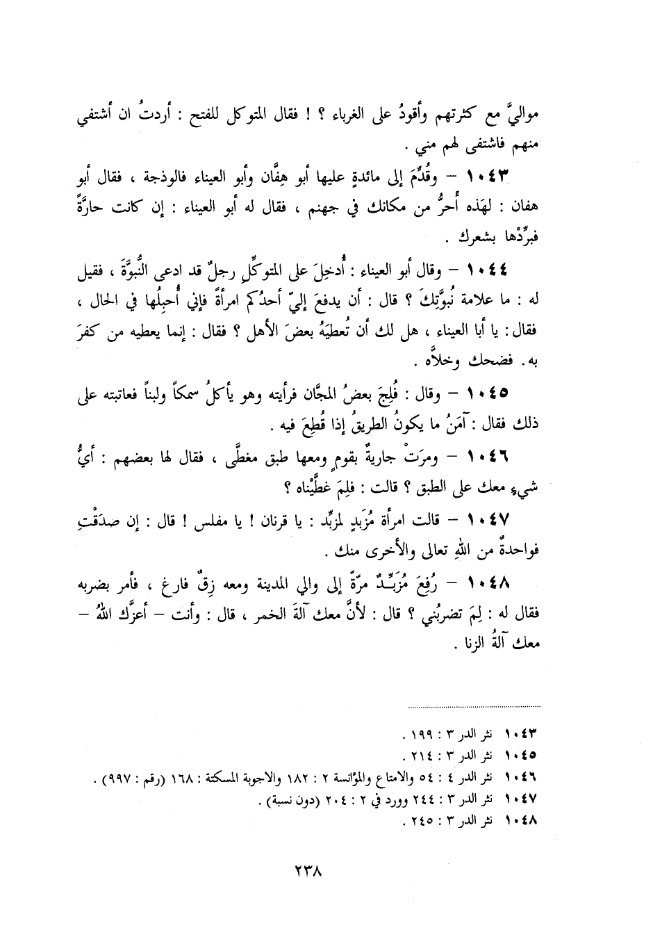 1044- وقال أبو العيناء: أدخل على المتوكّل رجل قد ادعى النّبوّة، فقيل له: ما علامة نبوّتك؟ قال: أن يدفع إليّ أحدكم امرأة فإني أحبلها في الحال، فقال: يا أبا العيناء، هل لك أن تعطيه بعض الأهل؟ فقال: إنما يعطيه من كفر به. فضحك وخلّاه.