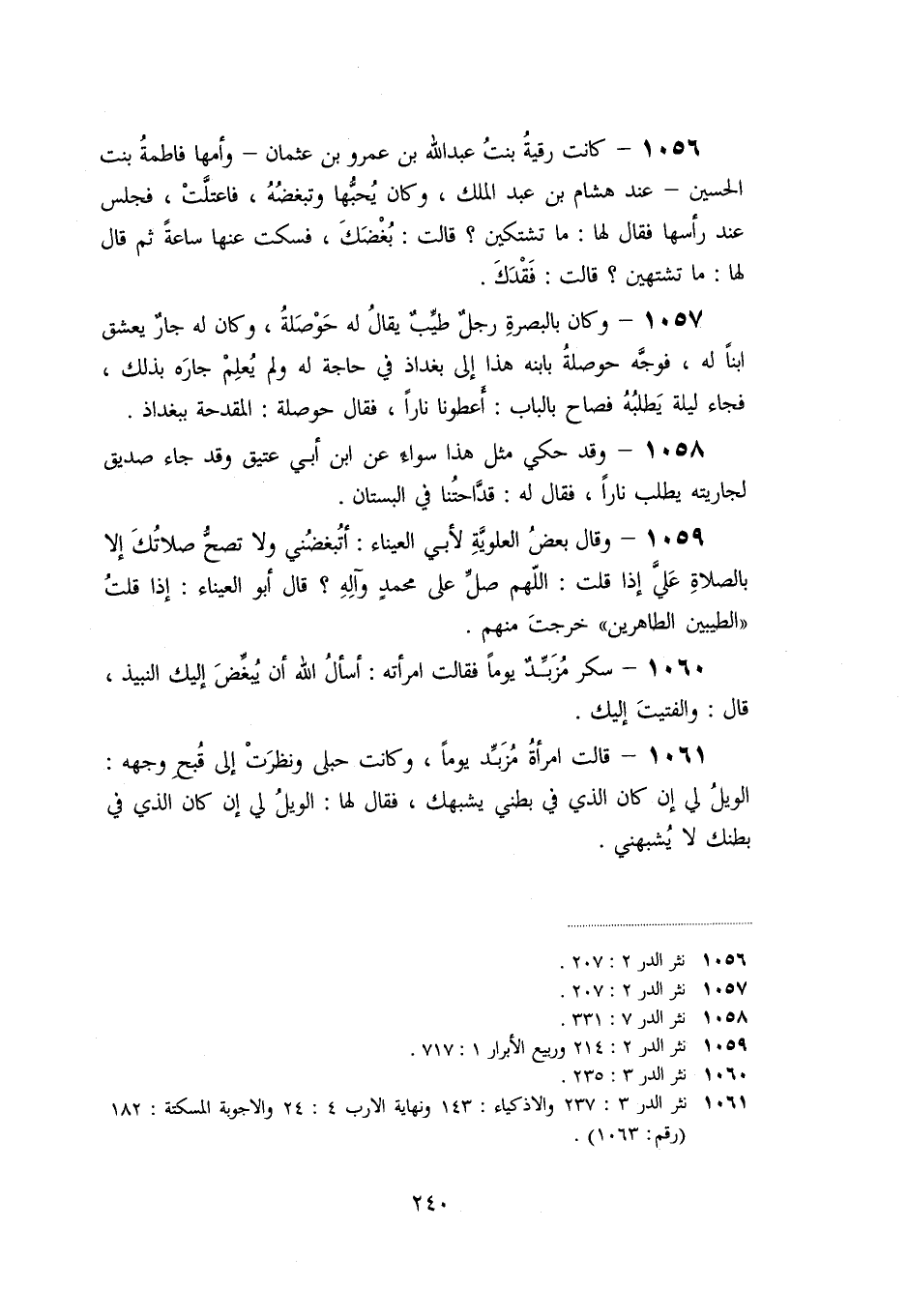 «1056» - كانت رقية بنت عبد الله بن عمرو بن عثمان- وأمها فاطمة بنت الحسين- عند هشام بن عبد الملك، وكان يحبّها وتبغضه، فاعتلّت، فجلس عند رأسها فقال لها: ما تشتكين؟ قالت: بغضك، فسكت عنها ساعة ثم قال لها: ما تشتهين؟ قالت: فقدك.