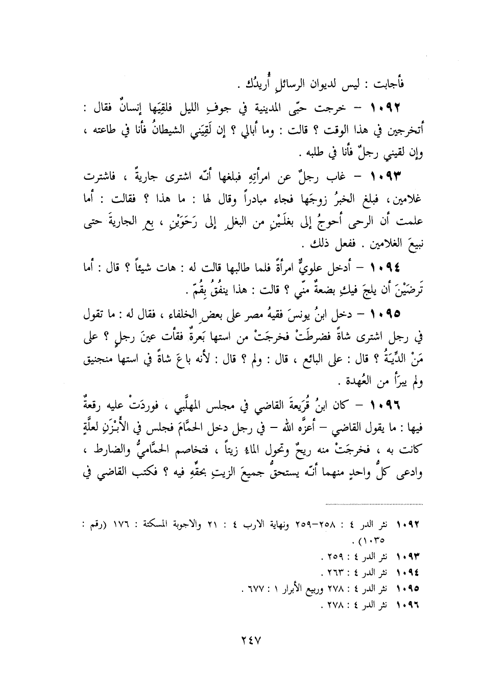 «1096» - كان ابن قريعة القاضي في مجلس المهلّبي، فوردت عليه رقعة فيها: ما يقول القاضي- أعزّه الله- في رجل دخل الحمّام فجلس في الأبزن لعلّة كانت به، فخرجت منه ريح وتحول الماء زيتا، فتخاصم الحمّاميّ والضارط، وادعى كلّ واحد منهما أنّه يستحقّ جميع الزيت بحقّه فيه؟ فكتب القاضي في
