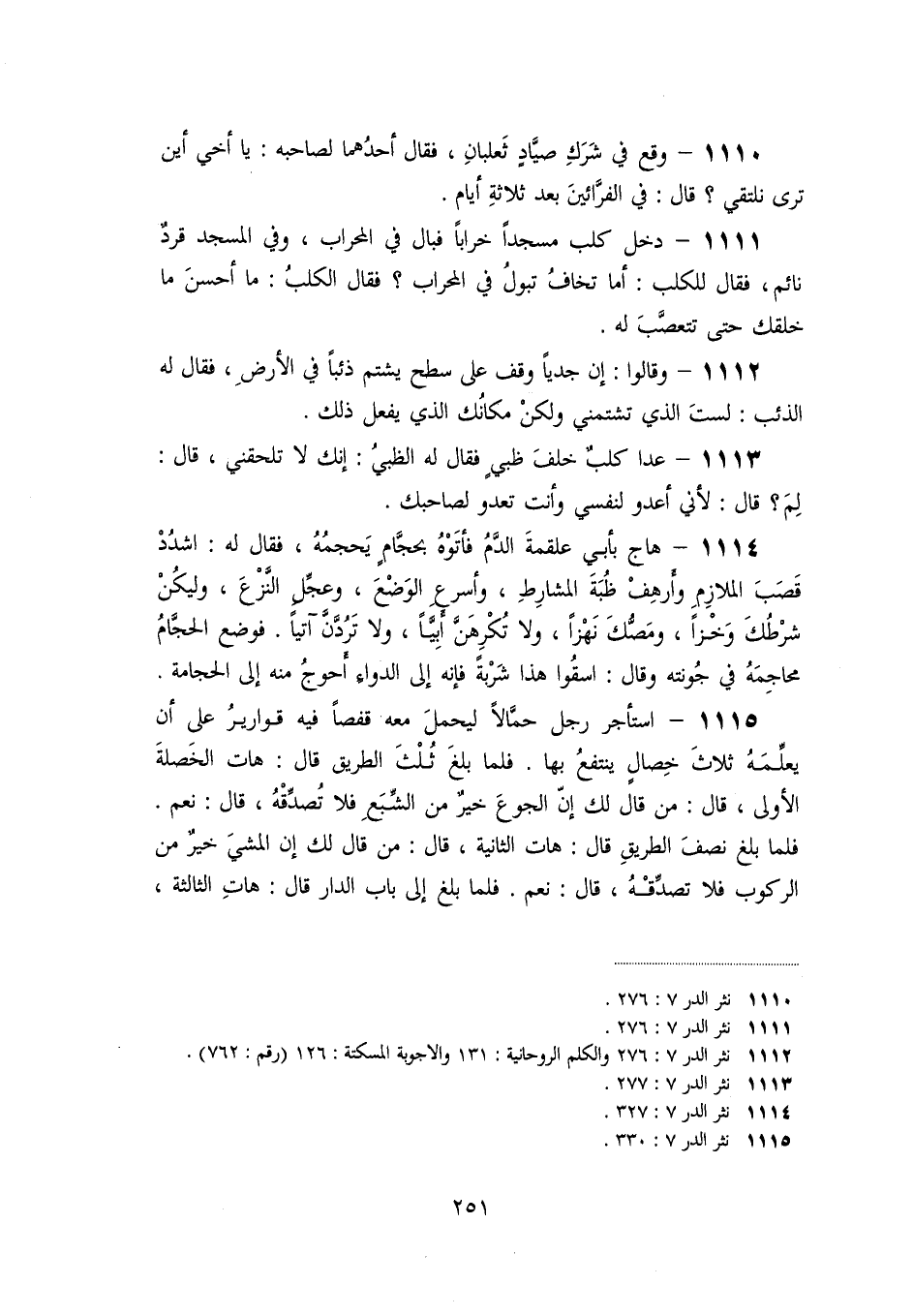 «1115» - استأجر رجل حمّالا ليحمل معه قفصا فيه قوارير على أن يعلّمه ثلاث خصال ينتفع بها. فلما بلغ ثلث الطريق قال: هات الخصلة الأولى، قال: من قال لك إنّ الجوع خير من الشّبع فلا تصدّقه، قال: نعم.