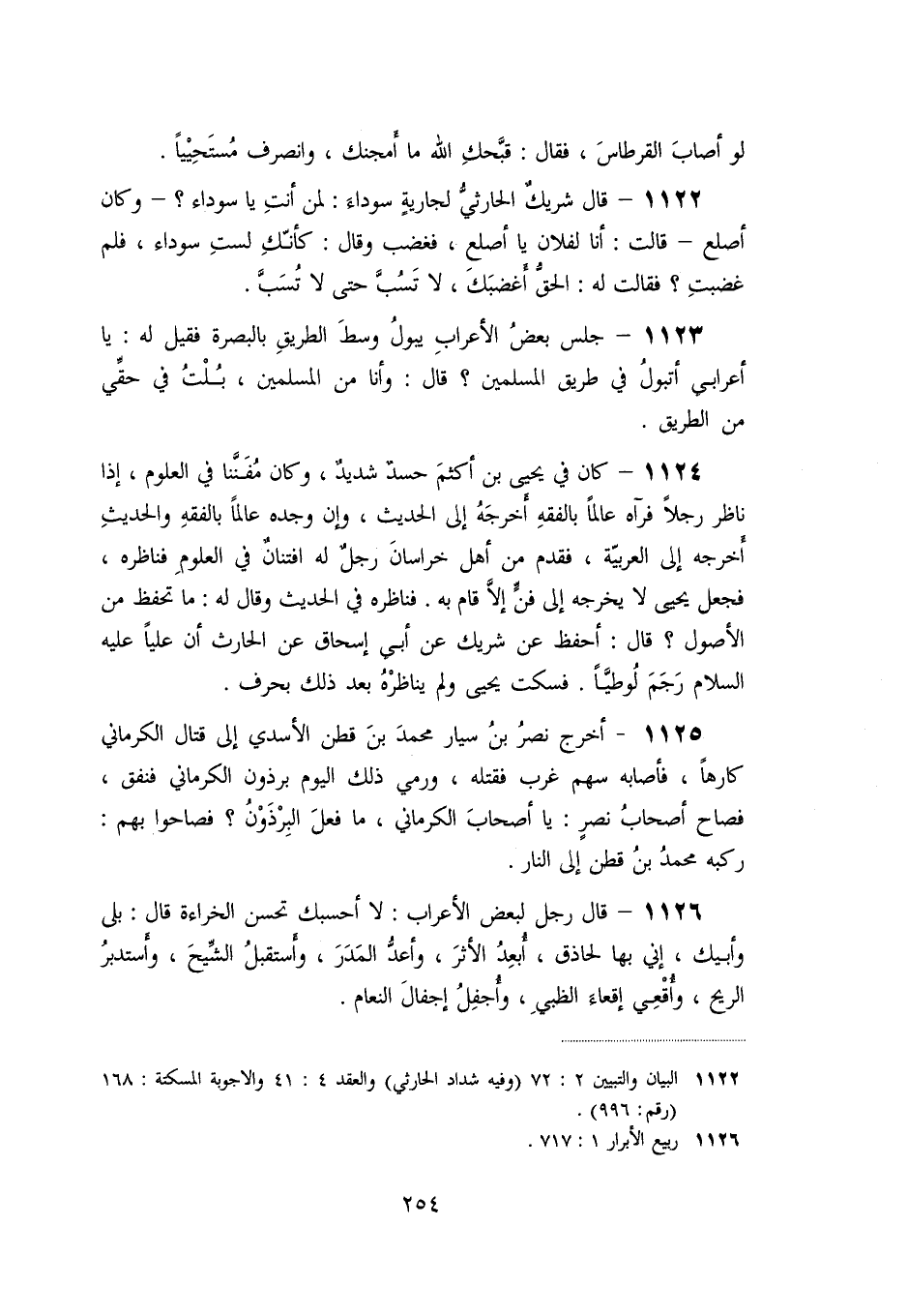 «1122» - قال شريك الحارثيّ لجارية سوداء: لمن أنت يا سوداء؟ - وكان أصلع- قالت: أنا لفلان يا أصلع، فغضب وقال: كأنّك لست سوداء، فلم غضبت؟ فقالت له: الحقّ أغضبك، لا تسبّ حتى لا تسبّ.