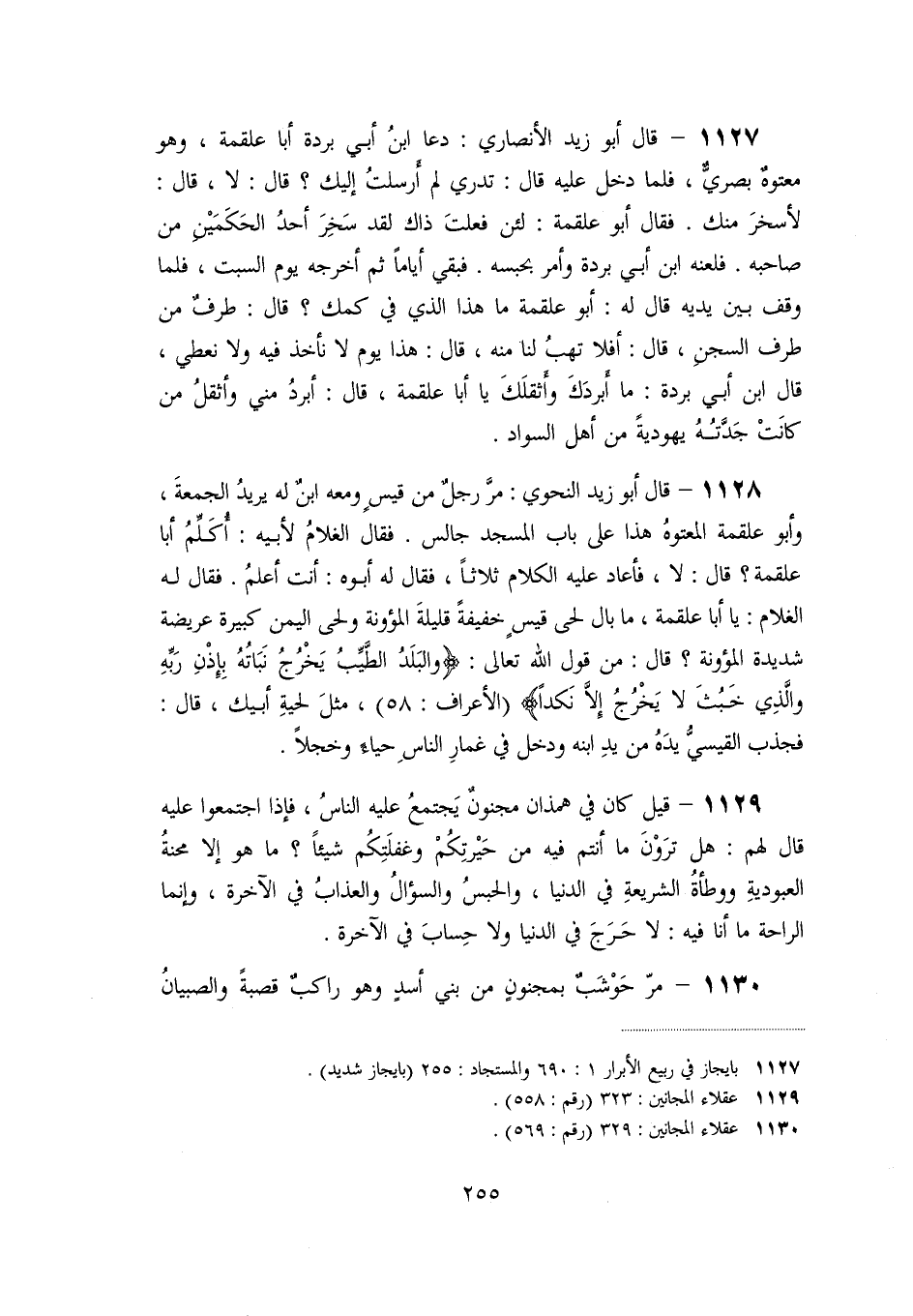 1128- قال أبو زيد النحوي: مرّ رجل من قيس ومعه ابن له يريد الجمعة، وأبو علقمة المعتوه هذا على باب المسجد جالس. فقال الغلام لأبيه: أكلّم أبا علقمة؟ قال: لا، فأعاد عليه الكلام ثلاثا، فقال له أبوه: أنت أعلم. فقال له الغلام: يا أبا علقمة، ما بال لحى قيس خفيفة قليلة المؤونة ولحى اليمن كبيرة عريضة شديدة المؤونة؟ قال: من قول الله تعالى: وَالْبَلَدُ الطَّيِّبُ يَخْرُجُ نَباتُهُ بِإِذْنِ رَبِّهِ وَالَّذِي خَبُثَ لا يَخْرُجُ إِلَّا نَكِداً