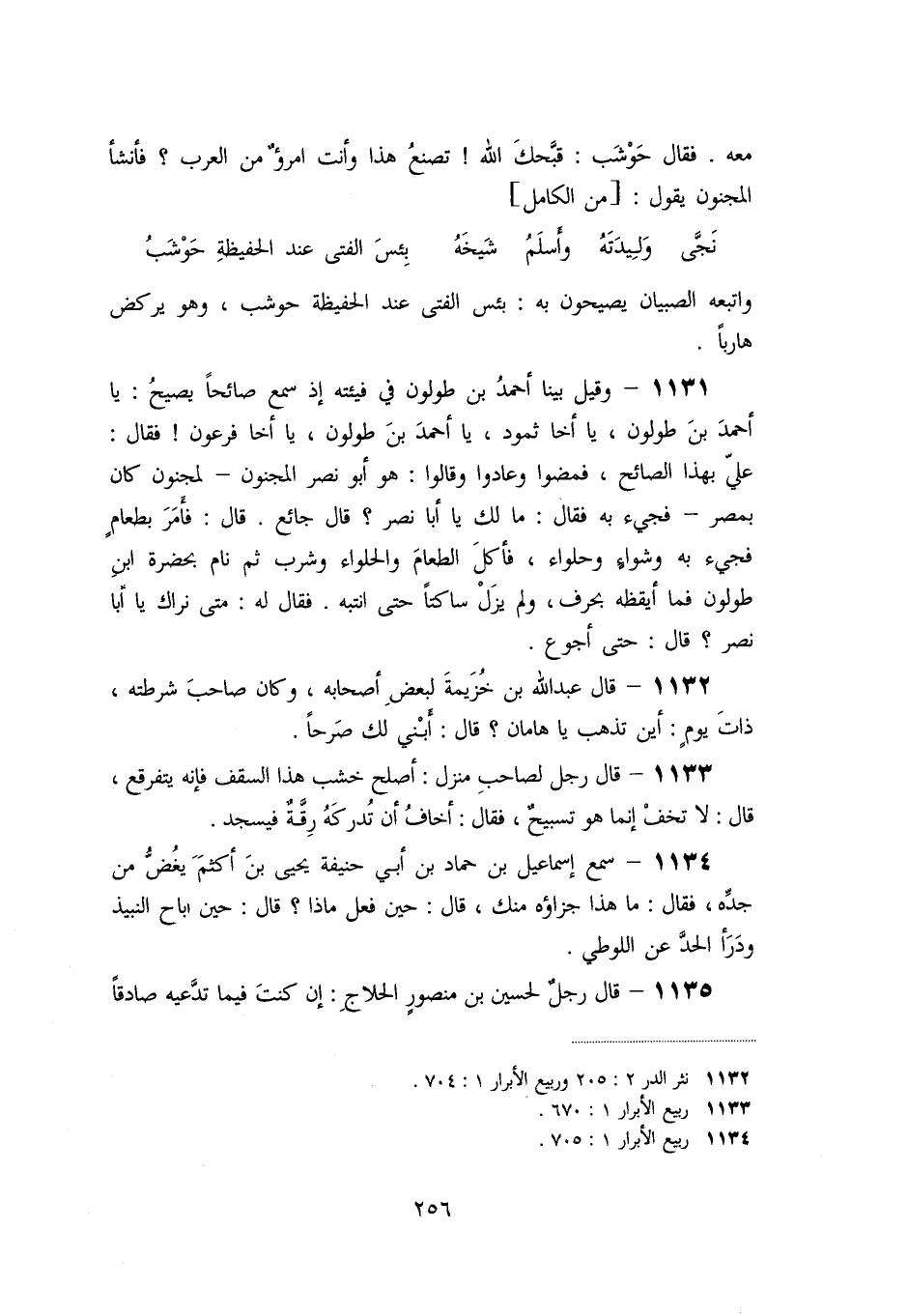 1131- وقيل بينا أحمد بن طولون في فيئته إذ سمع صائحا يصيح: يا أحمد بن طولون، يا أخا ثمود، يا أحمد بن طولون، يا أخا فرعون! فقال: