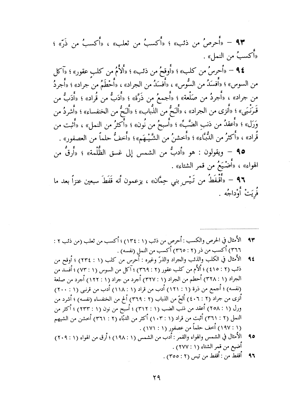 «93» - «أحرص من ذئب» ؛ «أكسب من ثعلب» ، «أكسب من ذرّ» ؛ «أكسب من النمل» .