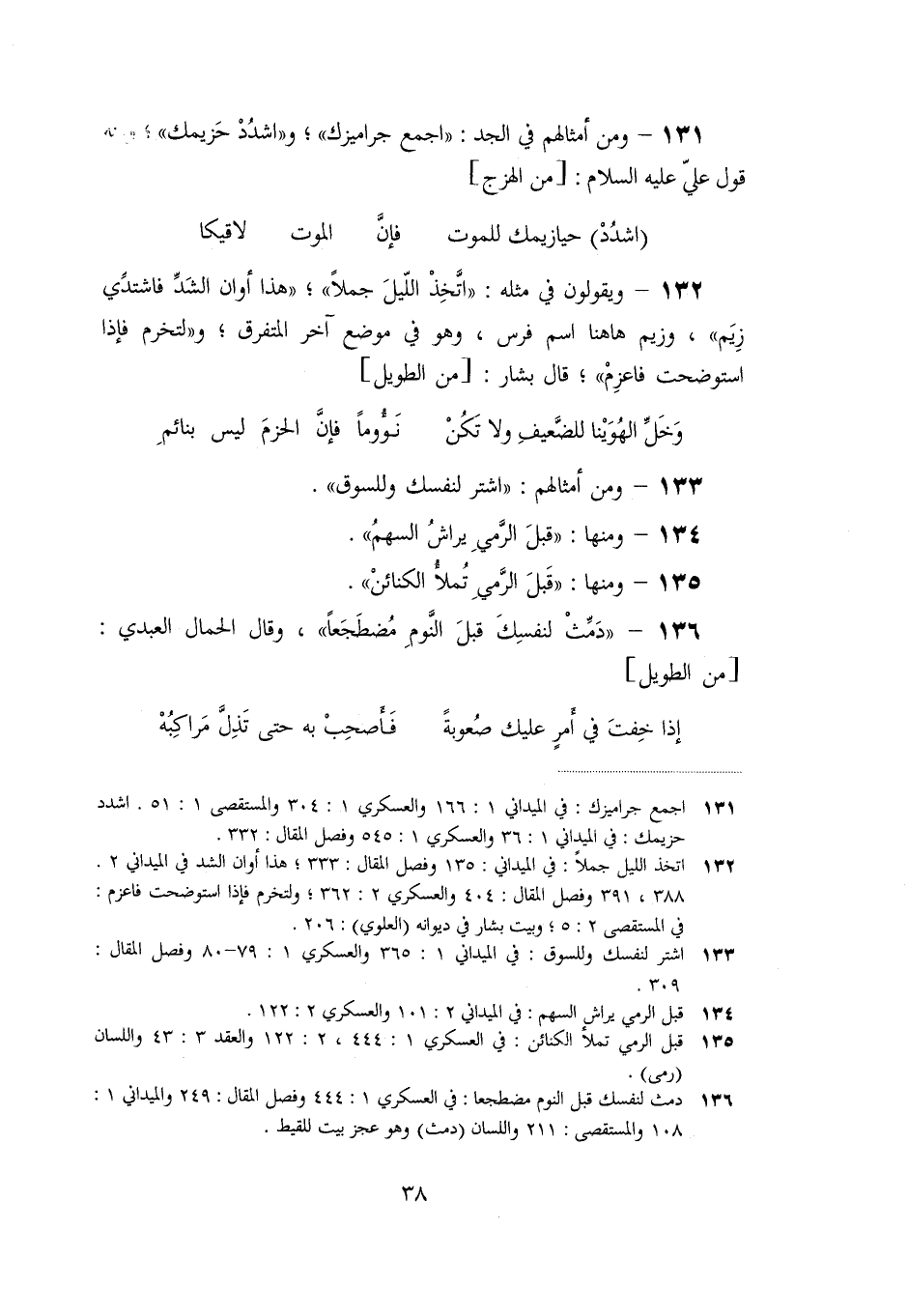 «131» - ومن أمثالهم في الجد: «اجمع جراميزك» ؛ و «اشدد حزيمك» ؛ وأنه قول عليّ عليه السّلام: [من الهزج]