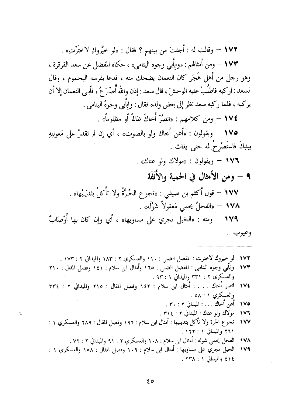 «173» - ومن أمثالهم: «وابأبي وجوه اليتامى» ، حكاه المفضل عن سعد القرقرة، وهو رجل من أهل هجر كان النعمان يضحك منه، فدعا بفرسه اليحموم، وقال لسعد: اركبه فاطلب عليه الوحش، قال سعد: إذن والله أصرع، فأبى النعمان إلا أن يركبه، فلما ركبه سعد نظر إلى بعض ولده فقال: وابأبي وجوه اليتامى.