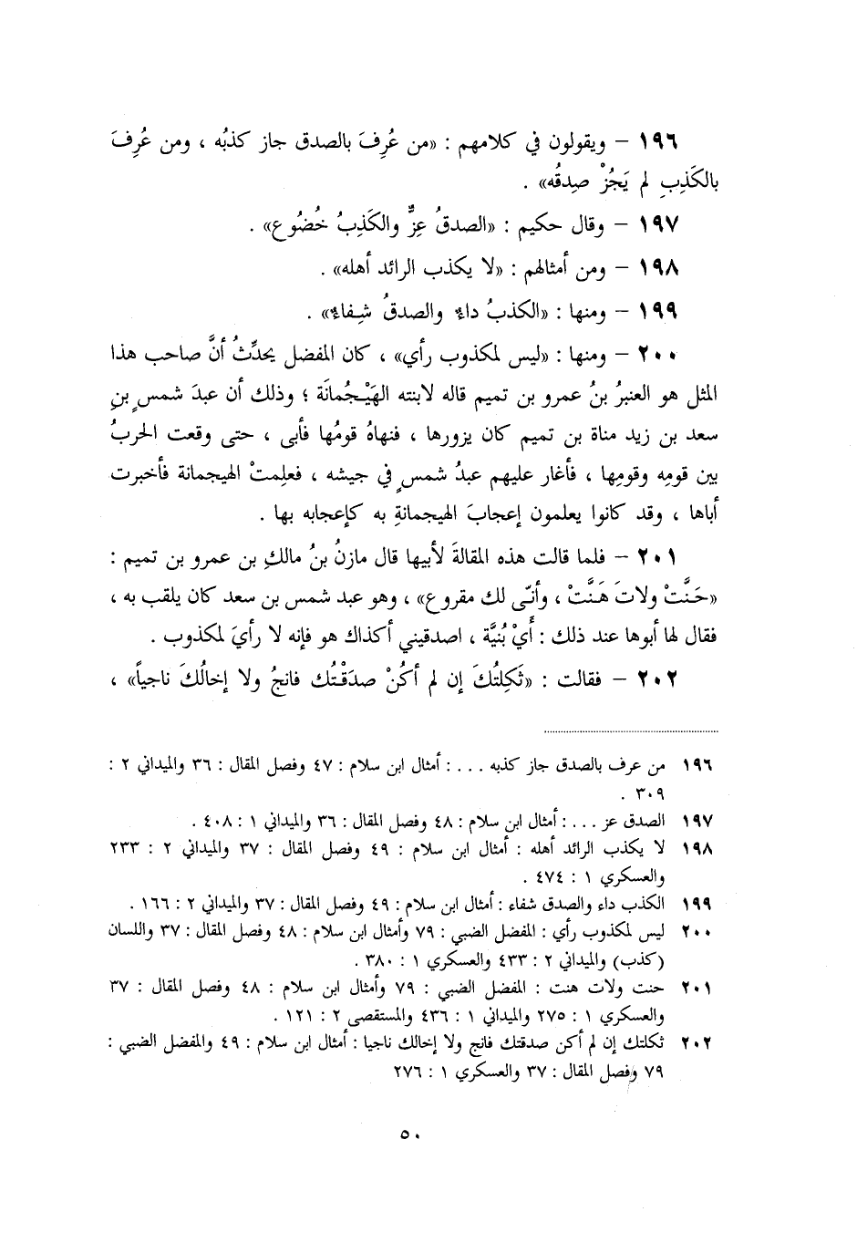 «200» - ومنها: «ليس لمكذوب رأي» ، كان المفضل يحدّث أنّ صاحب هذا المثل هو العنبر بن عمرو بن تميم قاله لابنته الهيجمانة؛ وذلك أن عبد شمس بن سعد بن زيد مناة بن تميم كان يزورها، فنهاه قومها فأبى، حتى وقعت الحرب بين قومه وقومها، فأغار عليهم عبد شمس في جيشه، فعلمت الهيجمانة فأخبرت أباها، وقد كانوا يعلمون إعجاب الهيجمانة به كإعجابه بها.