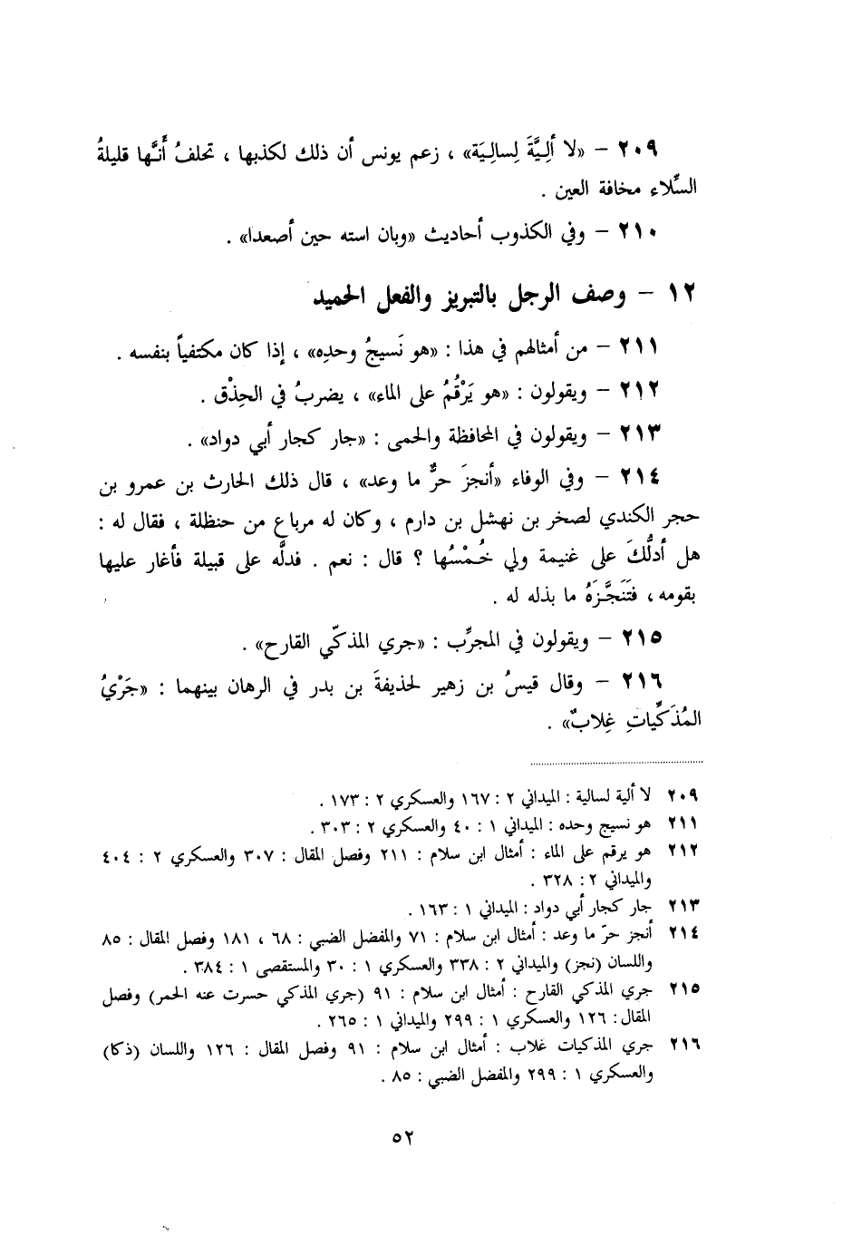 «214» - وفي الوفاء «أنجز حرّ ما وعد» ، قال ذلك الحارث بن عمرو بن حجر الكندي لصخر بن نهشل بن دارم، وكان له مرباع من حنظلة، فقال له: