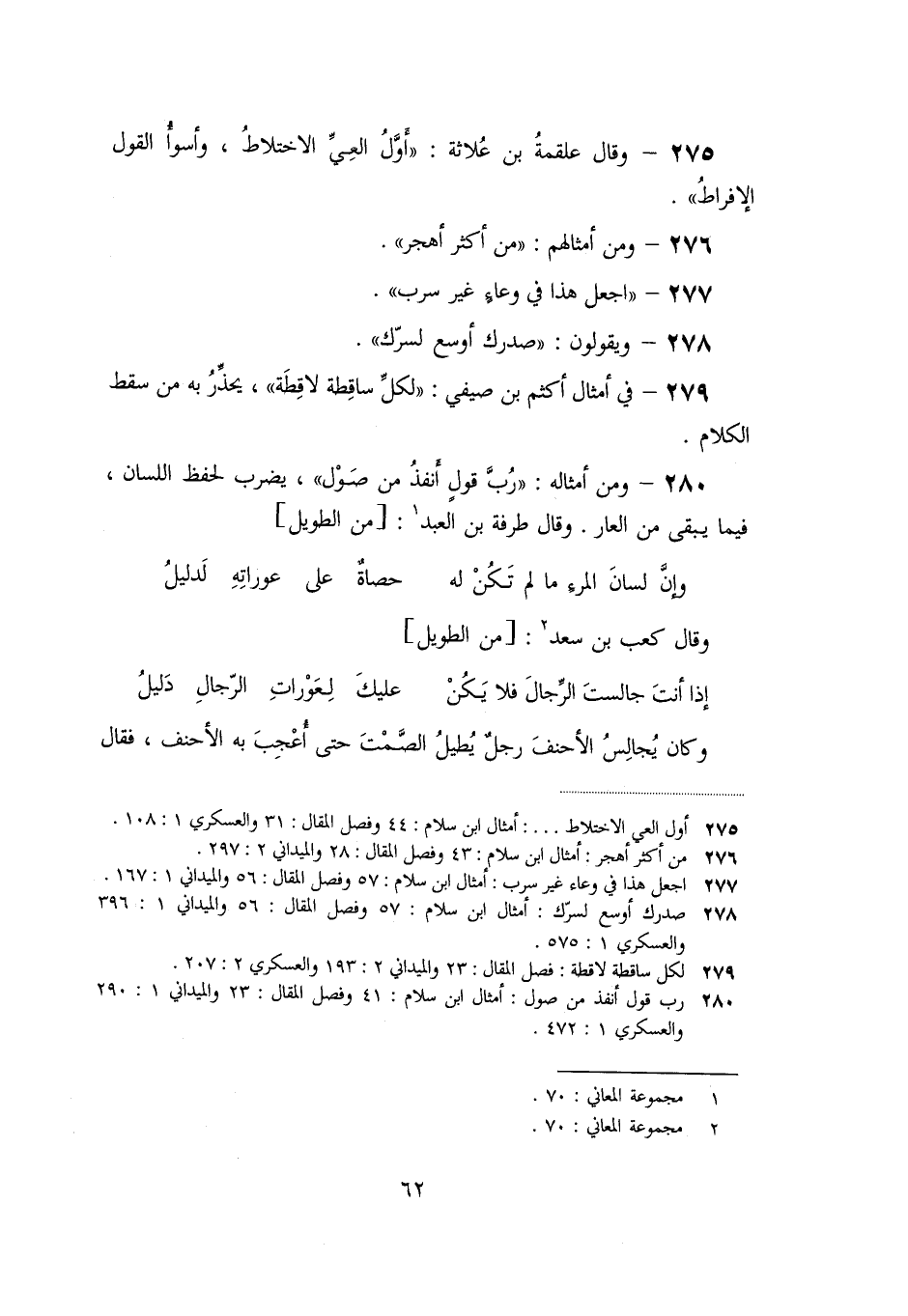 «279» - في أمثال أكثم بن صيفي: «لكلّ ساقطة لاقطة» ، يحذّر به من سقط الكلام.