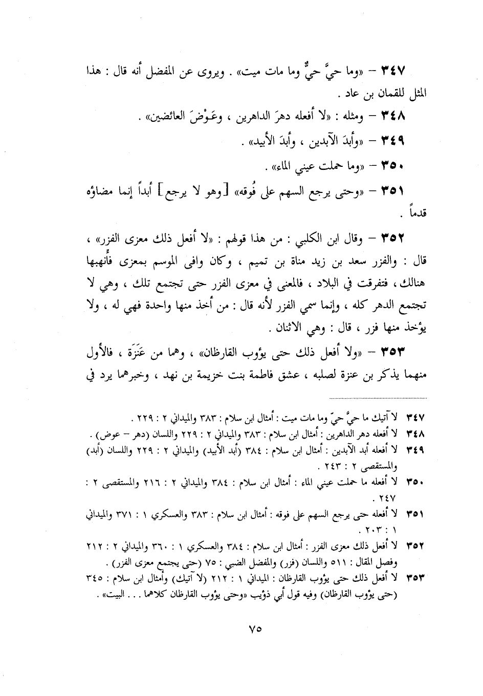 «353» - «ولا أفعل ذلك حتى يؤوب القارظان» ، وهما من عنزة، فالأول منهما يذكر بن عنزة لصلبه، عشق فاطمة بنت خزيمة بن نهد، وخبرهما يرد في