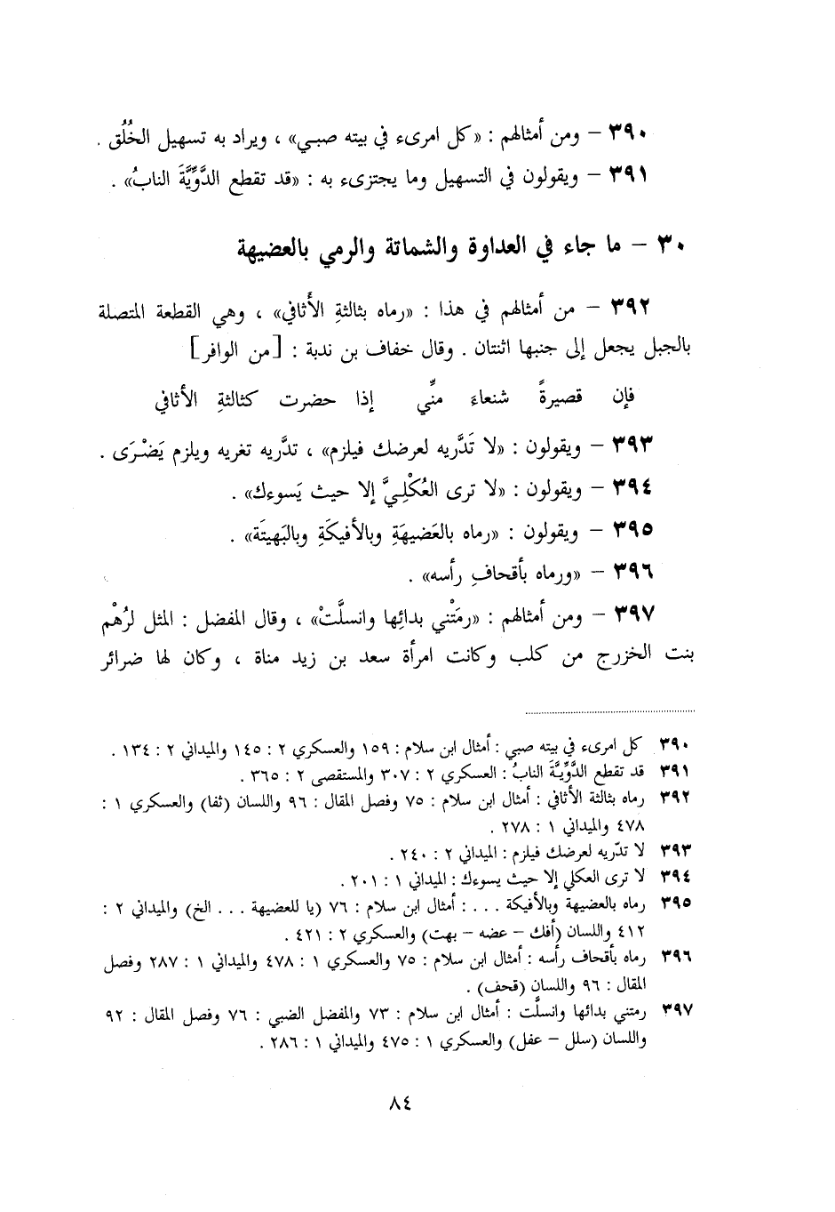 «392» - من أمثالهم في هذا: «رماه بثالثة الأثافي» ، وهي القطعة المتصلة بالجبل يجعل إلى جنبها اثنتان. وقال خفاف بن ندبة: [من الوافر]