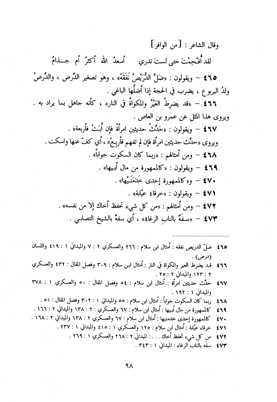 «465» - ويقولون: «ضلّ الدّريص نفقه» ، وهو تصغير الدّرص، والدّرص ولد اليربوع، يضرب في الحجة إذا أضلّها الباغي.
