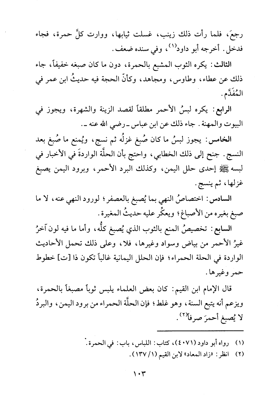 السابع: تخصيصُ المنع بالثوب الذي يُصبغ كلُّه، وأما ما فيه لون آخرُ غيرُ الأحمر من بياض وسواد وغيرها، فلا، وعلى ذلك تحمل الأحاديث الواردة في الحلة الحمراء؛ فإن الحلل اليمانية غالبًا تكون ذا [ت] خطوط حمر وغيرها.
